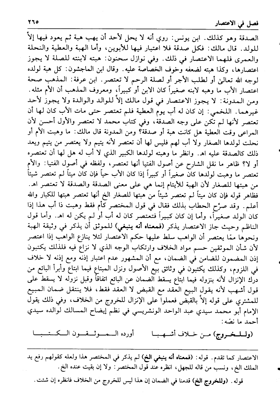 وأما قول الناظم وحيث جاز الاعتصار يذكر فمعناه أنه ينبغي للموثق أن يذكر في وثيقة الهبة ونحوها مما يعتصر أن الواهب سلط عليها حكم الاعتصار لئلا ينازع الواهب إذا اعتصر لأن شأن الموثقين حسم مواد الخلاف وارتكاب الوجه الذي لا نزاع فيه فلذلك يكتبون إذن المضمون للضامن في الضمان مع أن المشهور عدم اعتبار إذنه ومع إذنه لا خلاف في اللزوم وكذلك يكتبون في وثائق بيع الأصول ونزل المبتاع فيما ابتاع وأبرأ البائع من درك الإنزال لأنه بنزوله فيما ابتاع يسقط الضمان عن البائع اتفاقا وقبل نزوله لا يسقط على قول أشهب لأنه يقول البيع العقد مع القبض لا العقد فقط فلا ينتقل ضمان المبيع للمشتري على قوله إلا بالقبض فعملوا على الإنزال للخروج من الخلاف وفي ذلك يقول الإمام أبو محمد سيدي عبد الواحد الونشريسي في نظم إيضاح المسالك لوالده سيدي أحمد ما نصه وللخروج من خلاف أشهبا أورده الموثقون الكتبا