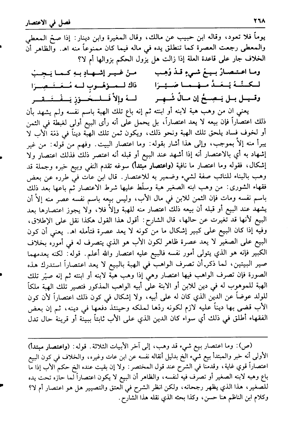 والظاهر أن الخلاف جار على قاعدة العلة إذا زالت هل يزول الحكم بزوالها أم لا وما اعتصار بيع شيء قد وهب من غير إشهاد به كما يجب لكنه يعد مهما صيرا ذاك لموهوب له معتصرا وقيل بل يصح إن مال شهر له وإلا فلحوز يفتقر يعني أن من وهب هبة لابنه أو ابنته ثم إنه باع تلك الهبة باسم نفسه ولم يشهد بأن ذلك اعتصار فإن بيعه لا يعد اعتصارا بل يحمل على أنه رأى البيع أولى لغبطة في الثمن أو لخوف فساد يلحق تلك الهبة ونحو ذلك ويكون ثمن تلك الهبة دينا في ذمة الأب لا يبرأ منه إلا بموجب وإلى هذا أشار بقوله وما اعتصار البيت وفهم من قوله من غير إشهاد به أي بالاعتصار أنه إذا أشهد عند البيع أو قبله أنه اعتصر ذلك فذلك اعتصار ولا إشكال فقوله وما اعتصار ما نافية واعتصار مبتدأ سوغه تقدم النفي وبيع خبره وجملة قد وهب بالبناء للنائب صفة لشيء وضمير به للاعتصار