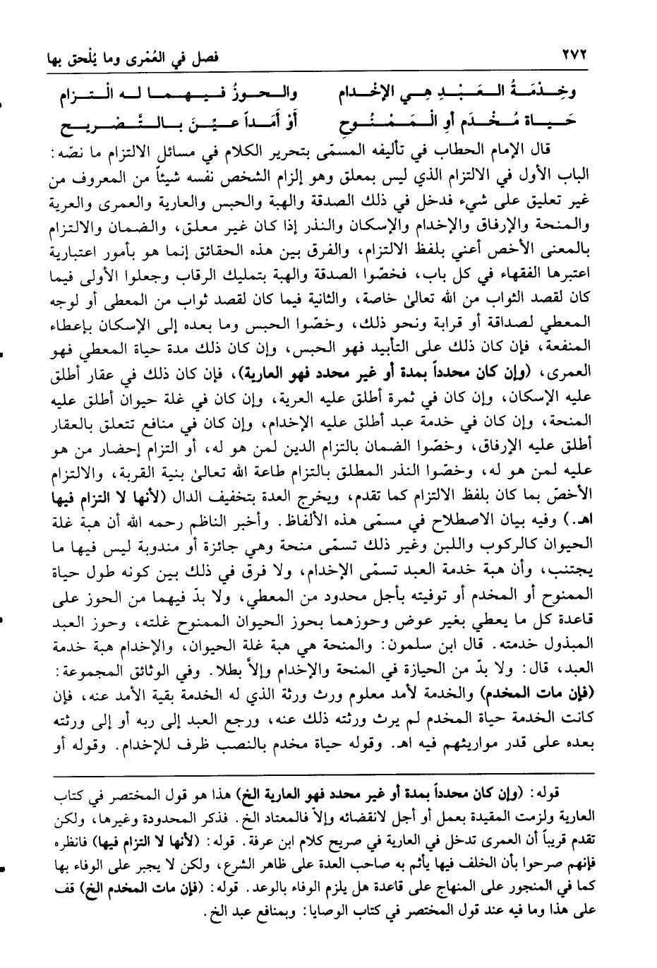وخدمة العبد هي الإخدام والحوز فيهما له التزام حياة مخدم أو الممنوح أو أمدا عين بالتصريح قال الإمام الحطاب في تأليفه المسمى بتحرير الكلام في مسائل الالتزام ما نصه الباب الأول في الالتزام الذي ليس بمعلق وهو إلزام الشخص نفسه شيئا من المعروف من غير تعليق على شيء فدخل في ذلك الصدقة والهبة والحبس والعارية والعمرى والعرية والمنحة والإرفاق والإخدام والإسكان والنذر إذا كان غير معلق والضمان والالتزام بالمعنى الأخص أعني بلفظ الالتزام والفرق بين هذه الحقائق إنما هو بأمور اعتبارية اعتبرها الفقهاء في كل باب فخصوا الصدقة والهبة بتمليك الرقاب وجعلوا الأولى فيما كان لقصد الثواب من الله تعالى خاصة والثانية فيما كان لقصد ثواب من المعطي أو لوجه المعطى لصداقة أو قرابة ونحو ذلك وخصوا الحبس وما بعده إلى الإسكان بإعطاء المنفعة فإن كان ذلك على التأبيد فهو الحبس وإن كان ذلك مدة حياة المعطى فهو العمرى وإن كان محددا بمدة أو غير محدد فهو العارية فإن كان ذلك في عقار أطلق عليه الإسكان