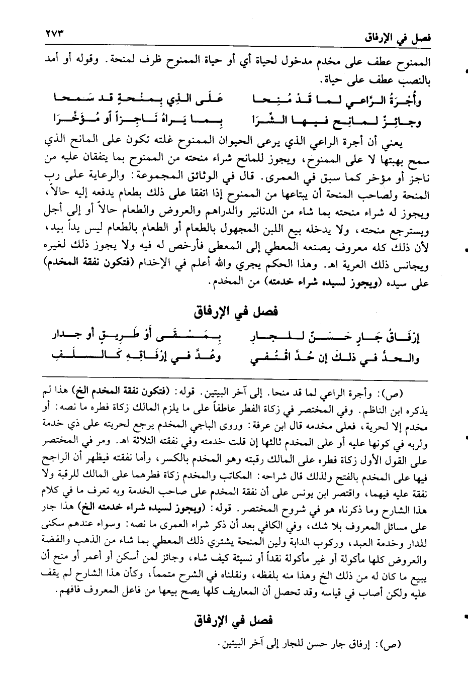 وهذا الحكم يجري والله أعلم في الإخدام فتكون نفقة المخدم على سيده ويجوز لسيده شراء خدمته من المخدم فصل في الإرفاق إرفاق جار حسن للجار بمسقى أو طريق أو جدار والحد في ذلك إن حد اقتفي وعد في إرفاقه كالسلف