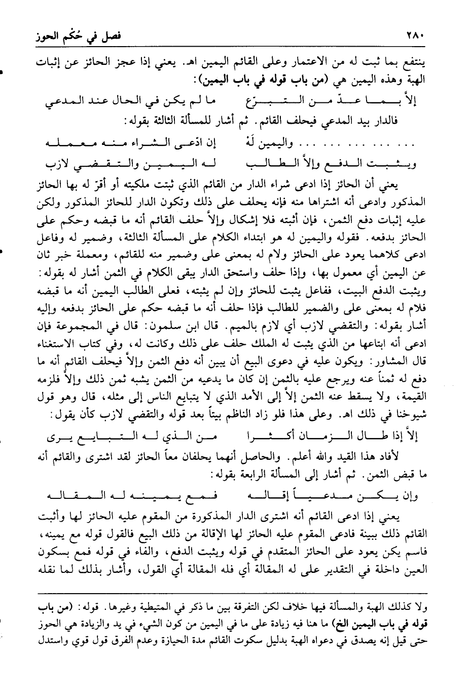 وعلى هذا فلو زاد الناظم بيتا بعد قوله والتقضي لازب كأن يقول إلا إذا طال الزمان أكثرا من الذي له التبايع يرى لأفاد هذا القيد والله أعلم والحاصل أنهما يحلفان معا الحائز لقد اشترى والقائم أنه ما قبض الثمن ثم أشار إلى المسألة الرابعة بقوله وإن يكن مدعيا إقاله فمع يمينه له المقاله يعني إذا ادعى القائم أنه اشترى الدار المذكورة من المقوم عليه الحائز لها وأثبت القائم ذلك ببينة فادعى المقوم عليه الحائز لها الإقالة من ذلك البيع فالقول قوله مع يمينه فاسم يكن يعود على الحائز المتقدم في قوله ويثبت الدفع والفاء في قوله فمع بسكون العين داخلة في التقدير على له المقاله أي فله المقالة أي القول وأشار بذلك لما نقله