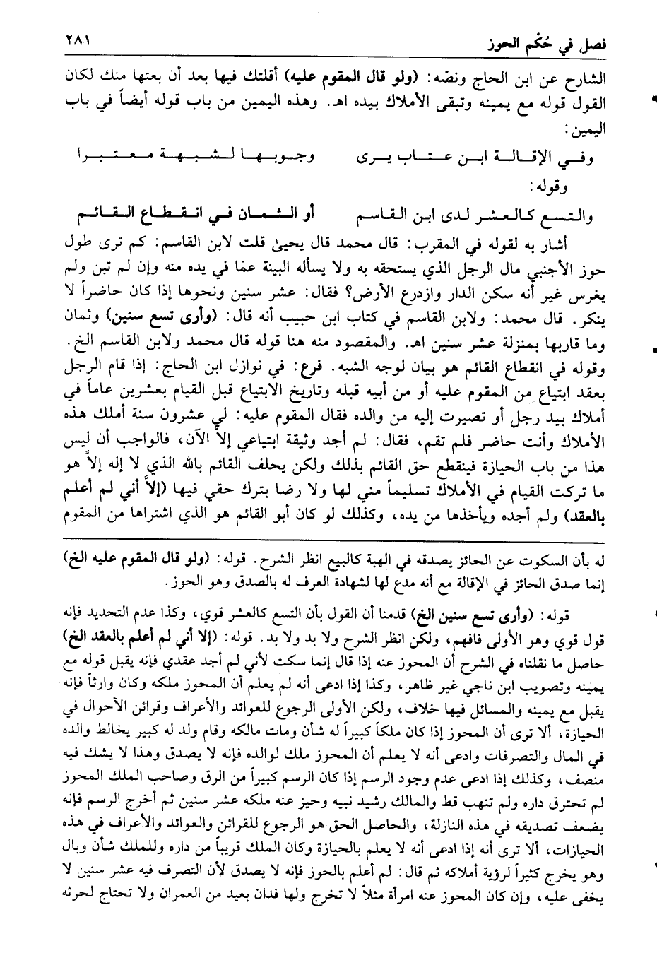 وهذه اليمين من باب قوله أيضا في باب اليمين وفي الإقالة ابن عتاب يرى وجوبها لشبهة معتبرا قوله والتسع كالعشر لدى ابن القاسم أو الثمان في انقطاع القائم أشار به لقوله في المقرب قال محمد قال يحيى قلت لابن القاسم كم ترى طول حوز الأجنبي مال الرجل الذي يستحقه به ولا يسأله البينة عما في يده منه وإن لم تبن ولم يغرس غير أنه سكن الدار وازدرع الأرض فقال عشر سنين ونحوها إذا كان حاضرا لا ينكر قال محمد ولابن القاسم في كتاب ابن حبيب أنه قال وأرى تسع سنين وثمان وما قاربها بمنزلة عشر سنين ا هـ