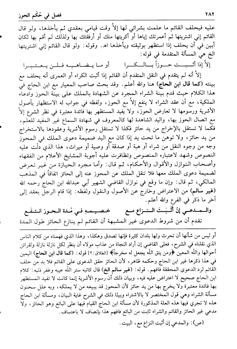 ولا يفيد المستظهر بها فائدة معتبرة في نظر الشرع إلا مع اتصال الحوز بها واليد الشاهدة لها كالمعروف في شهادة السماع غير المفيد للعلم فكما لا تستقل بالإخراج من يد حائز فكذا لا تستقل رسوم الأشرية وعقودها بالاستخراج من يد حائز ولا توهن ما تحت يد إذا كان مع اليد ضميمة دعوى الملك في المحوز وجه من وجوه النقل من شراء أو هبة أو صدقة أو وصية أو ميراث هذا الذي دلت عليه النصوص وشهد لاعتباره المنصوص وتظافرت عليه أجوبة المشايخ الأعلام من الفقهاء وأصحاب النوازل والأقوال والأحكام ثم قال وأما مجرد الحيازة من غير تعرض لضميمة دعوى الملك معها فلا تنقل الملك عن المحوز عنه إلى الحائز اتفاقا في المذهب المالكي ثم قال وإن ما وقع في نوازل القاضي الشهير أبي عبد الله بن الحاج رحمه الله غير سالم من الاعتراض وخارج عن الأصول والنقول ولفظه إذا قام الرجل بعقد إلى آخر ما ذكر في الفرع والله أعلم