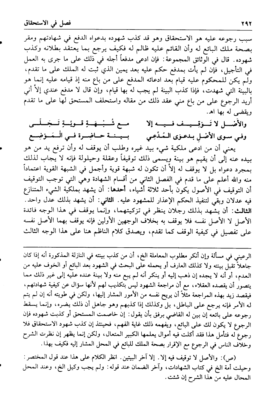 والأصل لا توقيف فيه إلا مع شبهة قوية تجلى وفي سوى الأصل بدعوى المدعي بينة حاضرة في الموضع يعني أن من ادعى ملكية شيء بيد غيره وطلب أن يوقف له وأن ترفع يد من هو بيده عنه إلى أن يقيم هو بينة ويسمى ذلك توقيفا وعقلة وحيلولة فإنه لا يجاب لذلك بمجرد دعواه بل لا يوقف له إلا أن تكون له شبهة قوية وأجمل في الشبهة القوية اعتمادا منه والله أعلم على ما قدم في الفصل الثاني من أقسام الشهادة وهي التي توجب التوقيف أن التوقيف في الأصول يكون بأحد ثلاثة أشياء أحدها أن يشهد بملكية الشيء المتنازع فيه عدلان وبقي لتنفيذ الحكم الإعذار للمشهود عليه