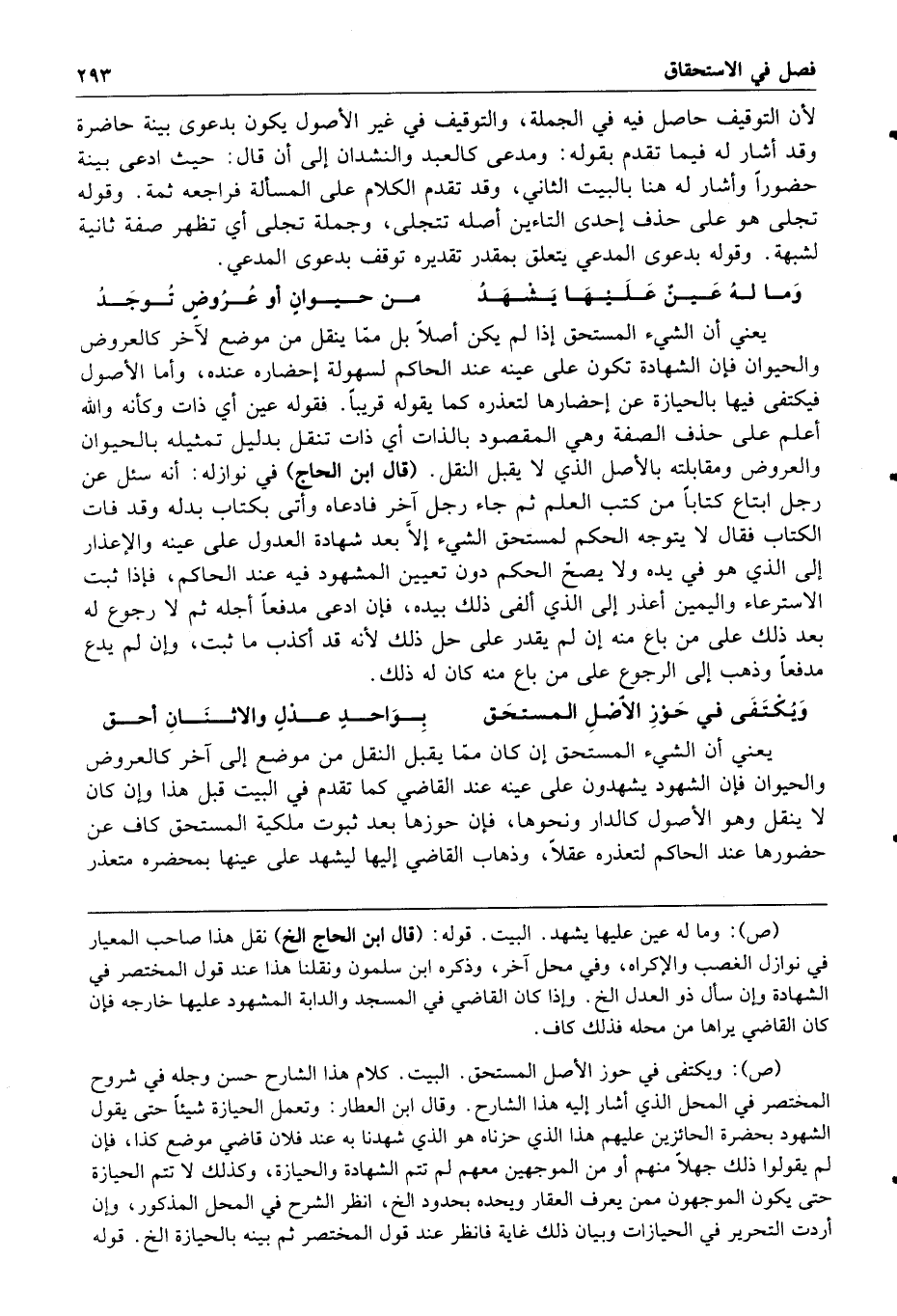 وما له عين عليها يشهد من حيوان أو عروض توجد يعني أن الشيء المستحق إذا لم يكن أصلا بل مما ينقل من موضع لآخر كالعروض والحيوان فإن الشهادة تكون على عينه عند الحاكم لسهولة إحضاره عنده وأما الأصول فيكتفى فيها بالحيازة عن إحضارها لتعذره كما يقوله قريبا فقوله عين أي ذات وكأنه والله أعلم على حذف الصفة وهي المقصود بالذات أي ذات تنقل بدليل تمثيله بالحيوان والعروض ومقابلته بالأصل الذي لا يقبل النقل قال ابن الحاج في نوازله أنه سئل عن رجل ابتاع كتابا من كتب العلم ثم جاء رجل آخر فادعاه وأتى بكتاب بدله وقد فات الكتاب فقال لا يتوجه الحكم لمستحق الشيء إلا بعد شهادة العدول على عينه والإعذار إلى الذي هو في يده ولا يصح الحكم دون تعيين المشهود فيه عند الحاكم فإذا ثبت الاسترعاء واليمين أعذر إلى الذي ألفي ذلك بيده فإن ادعى مدفعا أجله ثم لا رجوع له بعد ذلك على من باع منه إن لم يقدر على حل ذلك لأنه قد أكذب ما ثبت وإن لم يدع مدفعا وذهب إلى الرجوع على من باع منه كان له ذلك