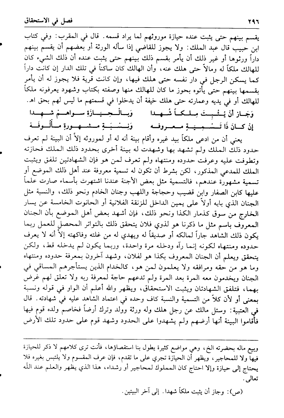وجاز أن يثبت ملكا شهدا وبالحيازة سواهم شهدا إن كان ذا تسمية معروفه ونسبة مشهورة مألوفه يعني أن من ادعى ملكا بيد غيره وأقام بينة أنه له أو لموروثه إلا أن البينة لم تعرف حدود ذلك الملك ولم تشهد بها وشهدت له بينة أخرى بحدود ذلك الملك فحازته وتطوفت عليه وعرفت حدوده ومنتهاه ولم تعرف لمن هو فإن الشهادتين تلفق ويثبت الملك للمدعي المذكور لكن بشرط أن تكون له تسمية معروفة عند أهل ذلك الموضع أو تسمية مشهورة عندهم فالتسمية مثل بعض الأجنة عندنا اشتهرت بأسماء صارت علما عليها كابن الصفار وابن قضيب وحجاجة واللهب وجنان الخادم ونحو ذلك والنسبة مثل الجنان الذي بابه أولا على يمين الداخل للزنقة الفلانية أو الحانوت الخامسة عن يسار الخارج من سوق كذمار الكذا ونحو ذلك