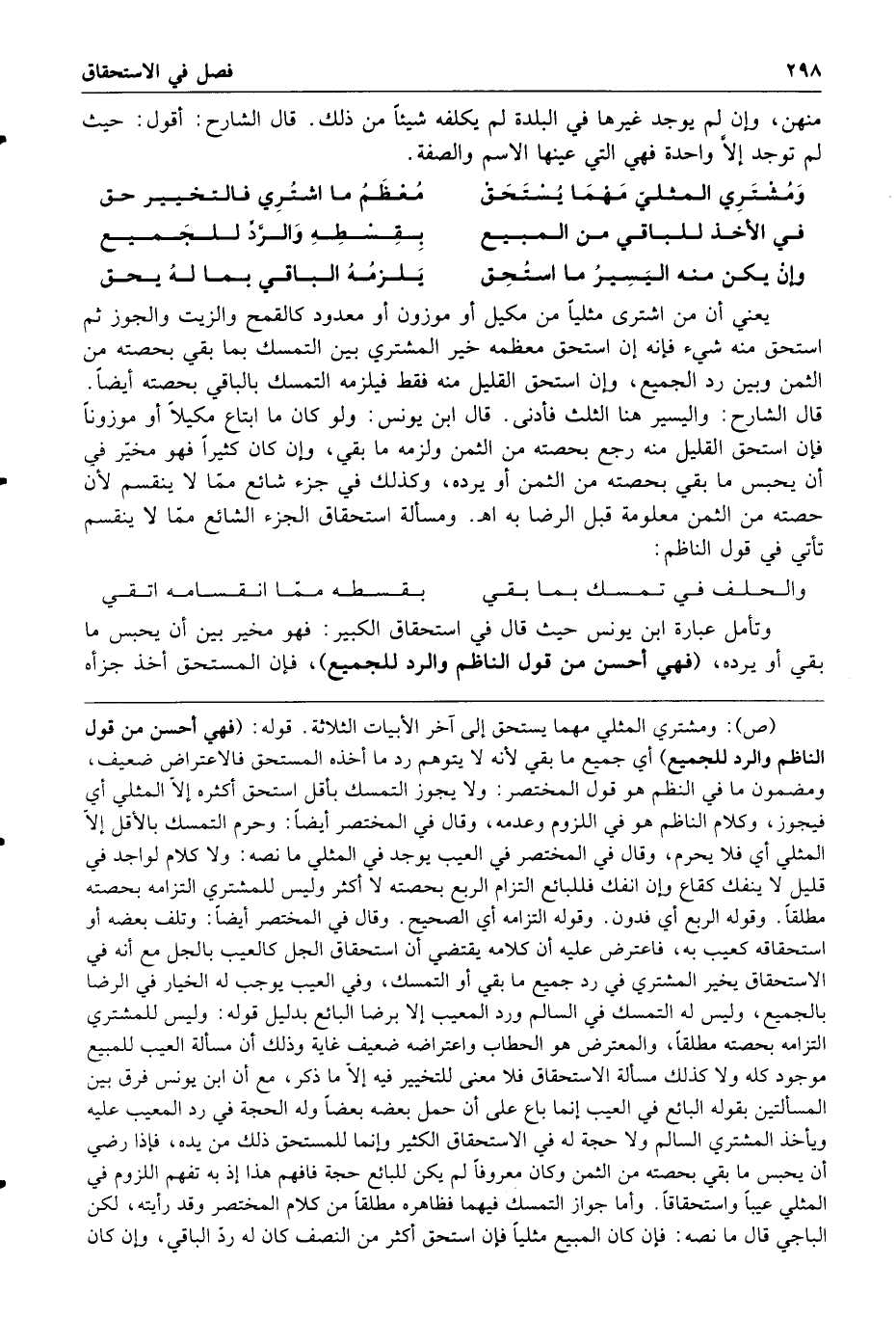ومشتري المثلي مهما يستحق معظم ما اشترى له التخيير حق في الأخذ للباقي من المبيع بقسطه والرد للجميع وإن يكن منه اليسير ما استحق يلزمه الباقي بما له يحق يعني أن من اشترى مثليا من مكيل أو موزون أو معدود كالقمح والزيت والجوز ثم استحق منه شيء فإنه إن استحق معظمه خير المشتري بين التمسك بما بقي بحصته من الثمن وبين رد الجميع وإن استحق القليل منه فقط فيلزمه التمسك بالباقي بحصته أيضا قال الشارح واليسير هنا الثلث فأدنى قال ابن يونس ولو كان ما ابتاع مكيلا أو موزونا فإن استحق القليل منه رجع بحصته من الثمن ولزمه ما بقي وإن كان كثيرا فهو مخير في أن يحبس ما بقي بحصته من الثمن أو يرده وكذلك في جزء شائع مما لا ينقسم لأن حصته من الثمن معلومة قبل الرضا به