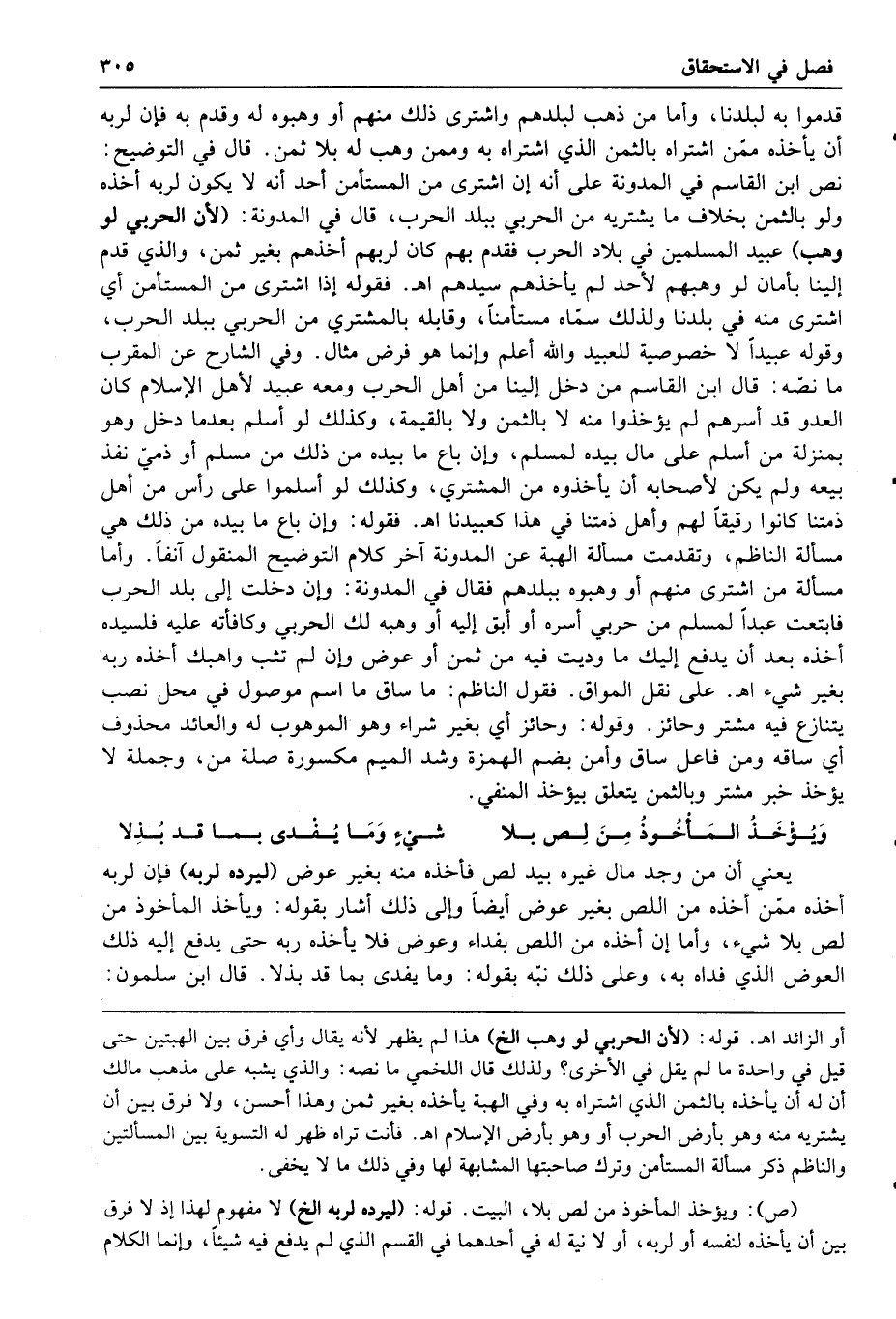 على نقل المواق فقول الناظم ما ساق ما اسم موصول في محل نصب يتنازع فيه مشتر وحائز وقوله وحائز أي بغير شراء وهو الموهوب له والعائد محذوف أي ساقه ومن فاعل ساق وأمن بضم الهمزة وشد الميم مكسورة صلة من وجملة لا يؤخذ خبر مشتر وبالثمن يتعلق بيؤخذ المنفي ويؤخذ المأخوذ من لص بلا شيء وما يفدى بما قد بذلا يعني أن من وجد مال غيره بيد لص فأخذه منه بغير عوض ليرده لربه فإن لربه أخذه ممن أخذه من اللص بغير عوض أيضا وإلى ذلك أشار بقوله ويؤخذ المأخوذ من لص بلا شيء وأما إن أخذه من اللص بفداء وعوض فلا يأخذه ربه حتى يدفع إليه ذلك العوض الذي فداه به وعلى ذلك نبه بقوله وما يفدى بما قد بذلا قال ابن سلمون