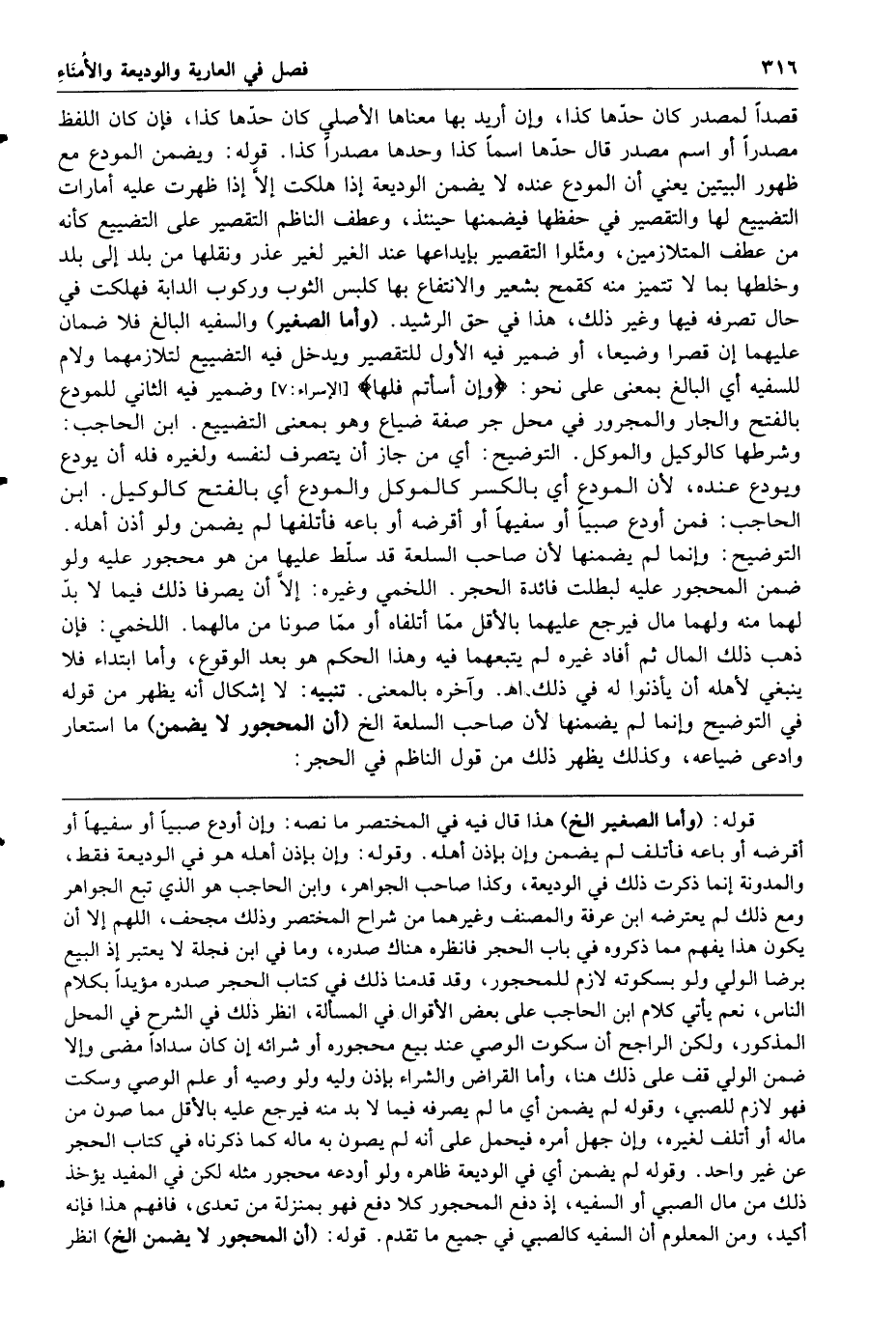 وضمير فيه الثاني للمودع بالفتح والجار والمجرور في محل جر صفة ضياع وهو بمعنى التضييع ابن الحاجب وشرطها كالوكيل والموكل التوضيح أي من جاز أن يتصرف لنفسه ولغيره فله أن يودع ويودع عنده لأن المودع أي بالكسر كالموكل والمودع أي بالفتح كالوكيل ابن الحاجب