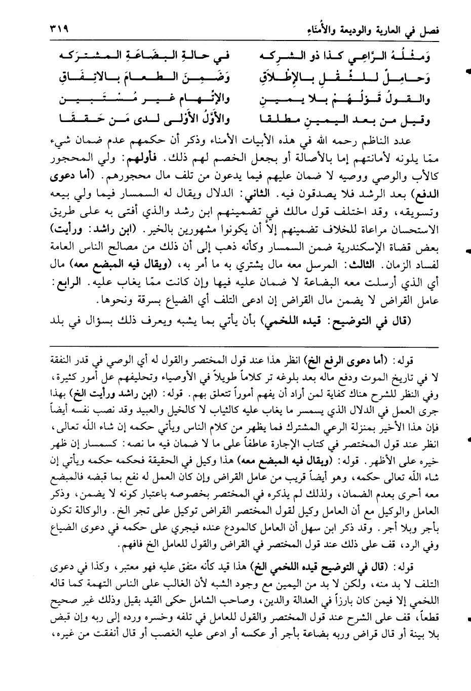 ومثله الراعي كذا ذو الشركه في حالة البضاعة المشتركه وحامل للثقل بالإطلاق وضمن الطعام بالاتفاق 1301 والقول قولهم بلا يمين والاتهام غير مستبين وقيل من بعد اليمين مطلقا والأول الأولى لدى من حققا عدد الناظم رحمه الله في هذه الأبيات الأمناء وذكر أن حكمهم عدم ضمان شيء مما يلونه لأمانتهم إما بالأصالة أو بجعل الخصم لهم ذلك