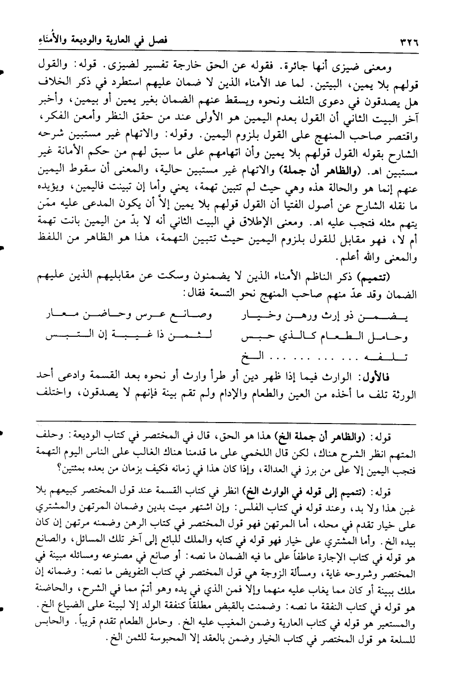 ومعنى الإطلاق في البيت الثاني أنه لا بد من اليمين بانت تهمة أم لا فهو مقابل للقول بلزوم اليمين حيث تتبين التهمة هذا هو الظاهر من اللفظ والمعنى والله أعلم