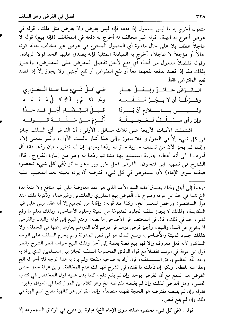 اشتملت الأبيات الأربعة على ثلاث مسائل الأولى أن القرض أي السلف جائز في كل شيء إلا في الجواري فلا يجوز وإلى هذا أشار بالبيت الأول وغير بمعنى إلا وإنما لم يجز لأن من تسلف جارية جاز له ردها بعينها إن لم تتغير فإن ردها فقد آل أمرهما إلى أنه أعطاه جارية استمتع بها مدة ثم ردها له وهو من إعارة الفروج