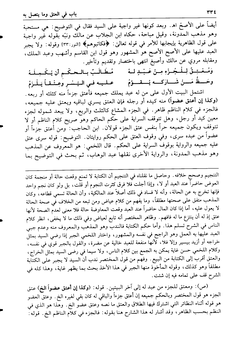 ومعتق للجزء من عبد له مطالب بالحكم أن يكمله وحظ من شاركه يقوم عليه في اليسر وعتقا يلزم اشتمل البيت الأول على من له عبد يملك جميعه فأعتق جزءا منه كثلثه أو ربعه وكذا إن أعتق عضوا منه كيده أو رجله فإن العتق يسري لباقيه ويعتق عليه جميعه فالجزء في كلام الناظم ظاهر في الجزء المشاع كالثلث والربع ولا يبعد شموله لجزء معين كيد أو رجل وهل تتوقف السراية على حكم الحاكم وهو صريح كلام الناظم أو لا تتوقف ويكون جميعه حرا بنفس عتق الجزء قولان ابن الحاجب ومن أعتق جزءا أو عضوا من عبده سرى وفي وقوف العتق على الحكم روايتان التوضيح قوله سرى عتق عليه جميعه والرواية بوقوف السراية على الحكم