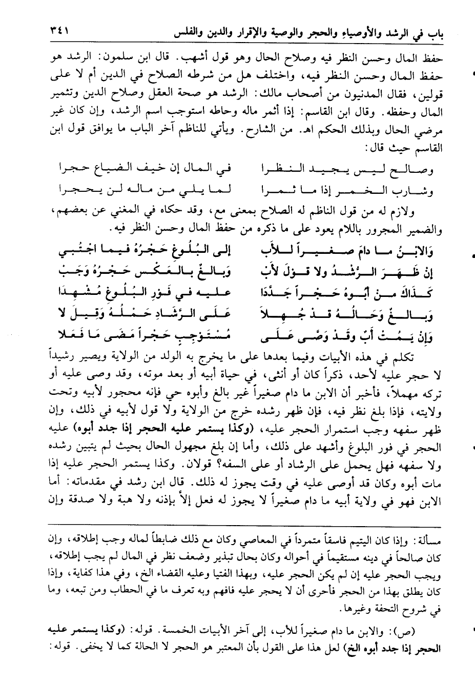 والابن ما دام صغيرا للأب إلى البلوغ حجره فيما اجتبي إن ظهر الرشد ولا قول لأب وبالغ بالعكس حجره وجب كذاك من أبوه حجرا جددا عليه في فور البلوغ مشهدا وبالغ وحاله قد جهلا على الرشاد حمله وقيل لا وإن يمت أب وقد وصى على مستوجب حجرا مضى ما فعلا تكلم في هذه الأبيات وفيما بعدها على ما يخرج به الولد من الولاية ويصير رشيدا لا حجر عليه لأحد ذكرا كان أو أنثى في حياة أبيه أو بعد موته