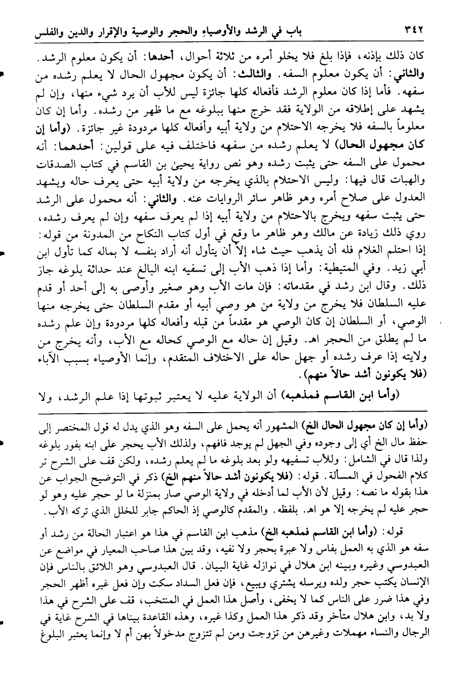 والثالث أن يكون مجهول الحال لا يعلم رشده من سفهه فأما إذا كان معلوم الرشد فأفعاله كلها جائزة ليس للأب أن يرد شيئا منها وإن لم يشهد على إطلاقه من الولاية فقد خرج منها ببلوغه مع ما ظهر من رشده وأما إن كان معلوما بالسفه فلا يخرجه الاحتلام من ولاية أبيه وأفعاله كلها مردودة غير جائزة وأما إن كان مجهول الحال لا يعلم رشده من سفهه فاختلف فيه على قولين أحدهما أنه محمول على السفه حتى يثبت رشده وهو نص رواية يحيى بن القاسم في كتاب الصدقات والهبات قال فيها وليس الاحتلام بالذي يخرجه من ولاية أبيه حتى يعرف حاله ويشهد العدول على صلاح أمره وهو ظاهر سائر الروايات عنه