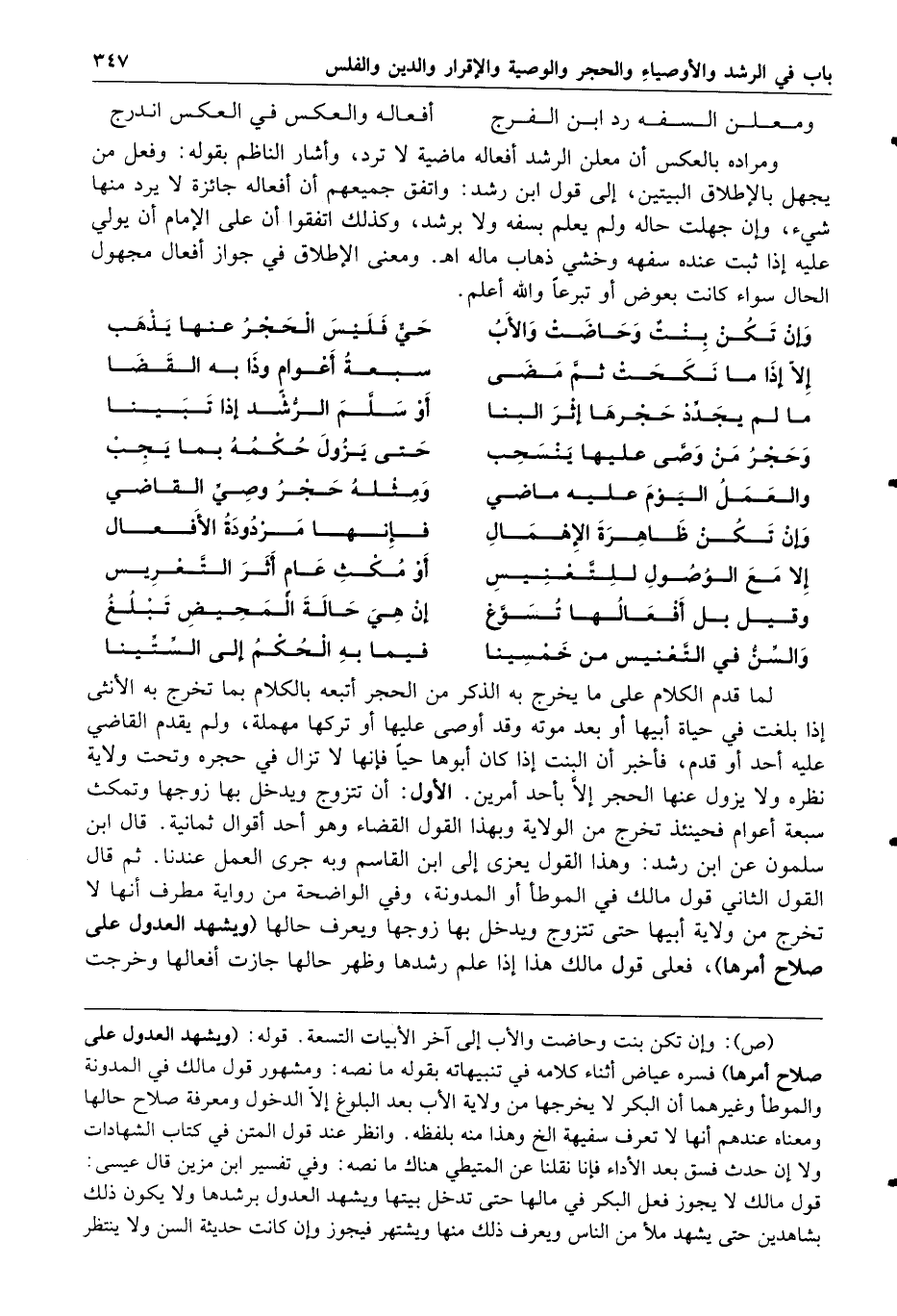 ومعلن السفه رد ابن الفرج أفعاله والعكس في العكس اندرج ومراده بالعكس أن معلن الرشد أفعاله ماضية لا ترد وأشار الناظم بقوله وفعل من يجهل بالإطلاق البيتين إلى قول ابن رشد واتفق جميعهم أن أفعاله جائزة لا يرد منها شيء وإن جهلت حاله ولم يعلم بسفه ولا برشد وكذلك اتفقوا أن على الإمام أن يولي عليه إذا ثبت عنده سفهه وخشي ذهاب ماله