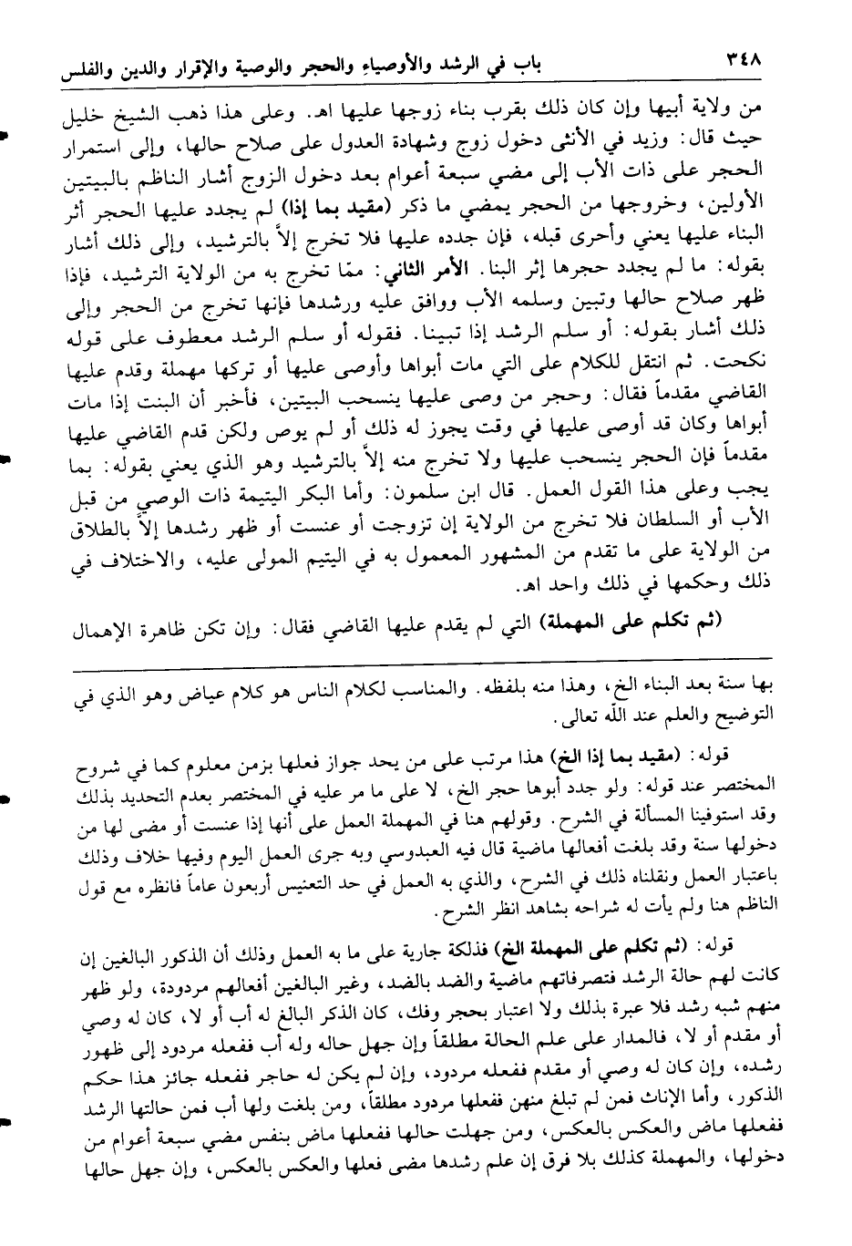 وإلى ذلك أشار بقوله ما لم يجدد حجرها إثر البنا الأمر الثاني مما تخرج به من الولاية الترشيد فإذا ظهر صلاح حالها وتبين وسلمه الأب ووافق عليه ورشدها فإنها تخرج من الحجر وإلى ذلك أشار بقوله أو سلم الرشد إذا تبينا فقوله أو سلم الرشد معطوف على قوله نكحت ثم انتقل للكلام على التي مات أبوها وأوصى عليها أو تركها مهملة وقدم عليها القاضي مقدما فقال وحجر من وصى عليها ينسحب البيتين فأخبر أن البنت إذا مات أبوها وكان قد أوصى عليها في وقت يجوز له ذلك أو لم يوص ولكن قدم القاضي عليها مقدما فإن الحجر ينسحب عليها ولا تخرج منه إلا بالترشيد وهو الذي يعني بقوله بما يجب