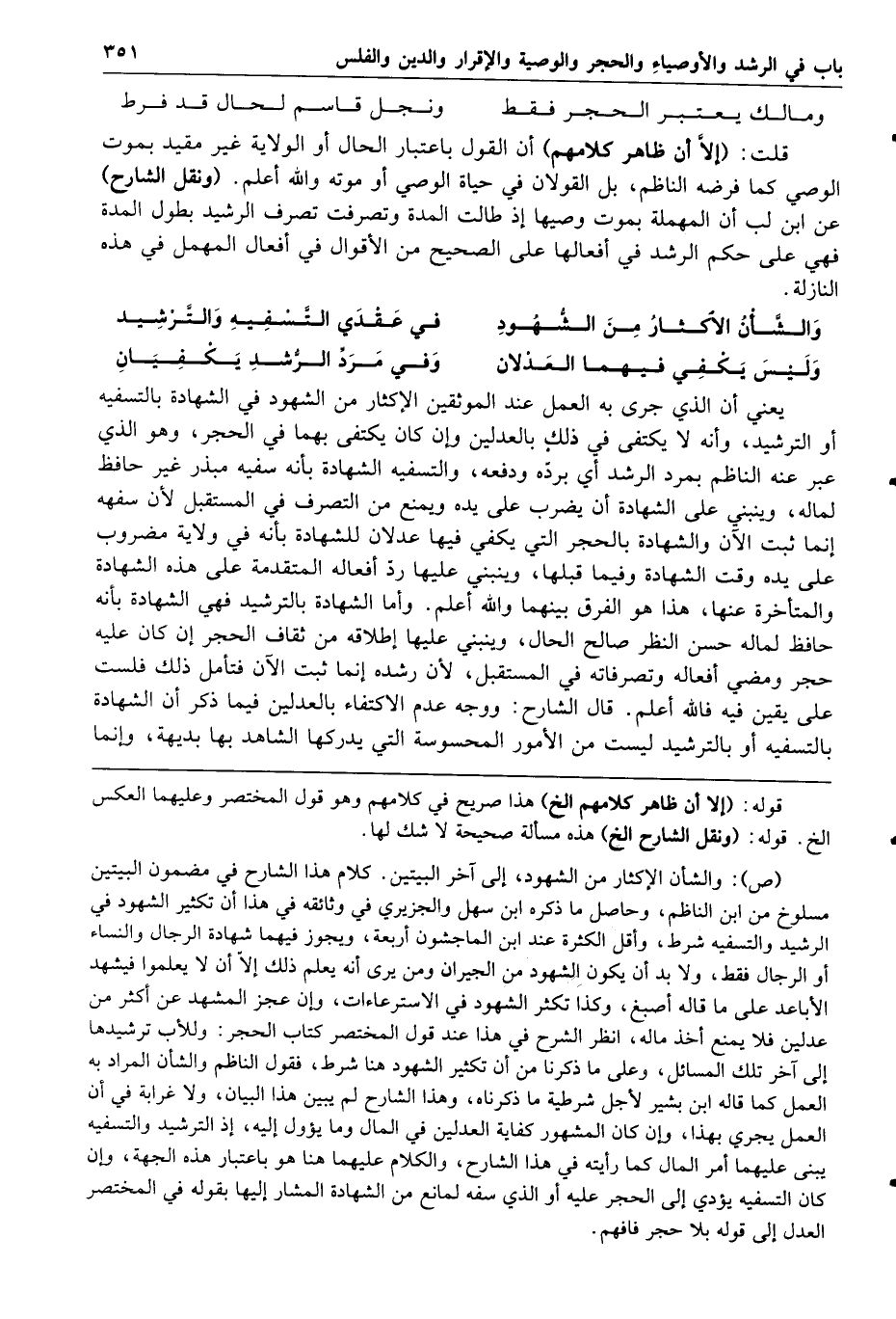ونقل الشارح عن ابن لب أن المهملة بموت وصيها إذ طالت المدة وتصرفت تصرف الرشيد بطول المدة فهي على حكم الرشد في أفعالها على الصحيح من الأقوال في أفعال المهمل في هذه النازلة والشأن الإكثار من الشهود في عقدي التسفيه والترشيد وليس يكفي فيهما العدلان وفي مرد الرشد يكفيان يعني أن الذي جرى به العمل عند الموثقين الإكثار من الشهود في الشهادة بالتسفيه أو الترشيد وأنه لا يكتفى في ذلك بالعدلين وإن كان يكتفى بهما في الحجر وهو الذي عبر عنه الناظم بمرد الرشد أي برده ودفعه