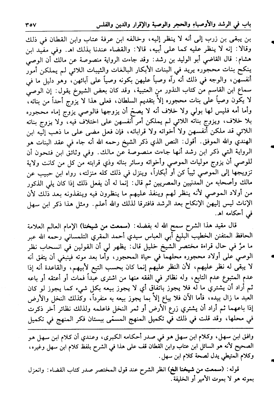 وفي مفيد ابن هشام قال القاضي أبو الوليد بن رشد وقد جاءت الرواية منصوصة عن مالك أن الوصي ينكح بنات محجوره يريد في البنات الأبكار البالغات والثيبات اللائي لم يملكن أمور أنفسهن
