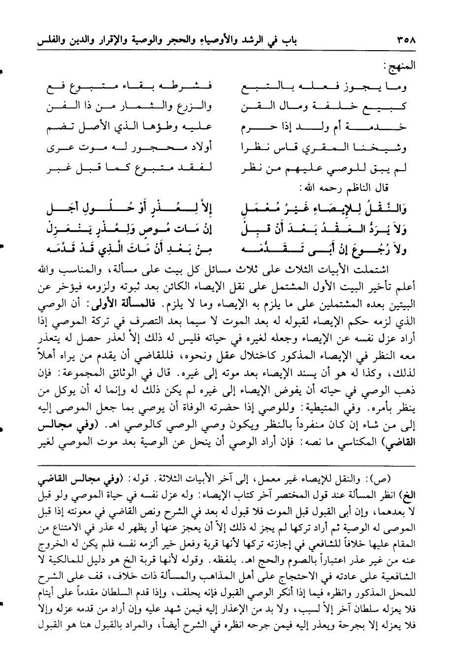 قال الناظم رحمه الله والنقل للإيصاء غير معمل إلا لعذر أو حلول أجل ولا يرد العقد بعد أن قبل إن مات موص ولعذر ينعزل ولا رجوع إن أبى تقدمه من بعد أن مات الذي قد قدمه اشتملت الأبيات الثلاث على ثلاث مسائل كل بيت على مسألة والمناسب والله أعلم تأخير البيت الأول المشتمل على نقل الإيصاء الكائن بعد ثبوته ولزومه فيؤخر عن البيتين بعده المشتملين على ما يلزم به الإيصاء وما لا يلزم