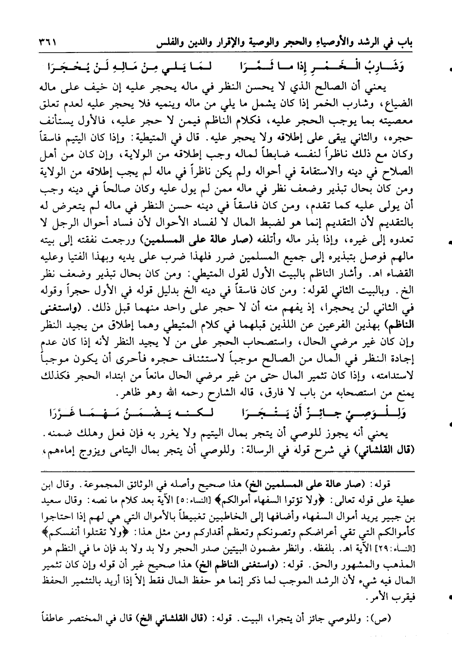 وأشار الناظم بالبيت الأول لقول المتيطي ومن كان بحال تبذير وضعف نظر إلخ وبالبيت الثاني لقوله ومن كان فاسقا في دينه إلخ بدليل قوله في الأول حجرا وقوله في الثاني لن يحجرا إذ يفهم منه أن لا حجر على واحد منهما قبل ذلك