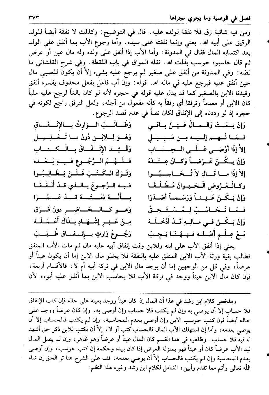 وإن يمت والمال عين باقي وطالب الوارث بالإنفاق فما لهم إليه من سبيل وهو للابن دون ما تعليل إلا إذا أوصى على الحساب وقيد الإنفاق بالكتاب وإن يكن عرضا وكان عنده فلهم الرجوع فيه بعده إلا إذا ما قال لا تحاسبوا وترك الكتب فلن يطالبوا وكالعروض الحيوان مطلقا فيه الرجوع بالذي قد أنفقا وإن يكن عينا ورسما أصدرا بأنه ذمته قد عمرا فما تحاسب لمستحق وهو كالحاضر دون فرق وإن يكن في ماله قد أدخله من غير إشهاد بذاك أعمله مع علم أصله فههنا يجب رجوع وارث بإنفاق طلب يعني إذا أنفق الأب على ابنه وللابن وقت إنفاق أبيه عليه مال ثم مات الأب المنفق فطالب بقية ورثة الأب الابن المنفق عليه بالنفقة فلا يخلو مال الابن إما أن يكون عينا أو عرضا وفي كل من الوجهين إما أن يوجد مال الابن في تركة أبيه أم لا فالأقسام أربعة فإن كان مال الابن عينا ووجد في تركة الأب فلا يحاسب الابن بما أنفق عليه أبوه لأن