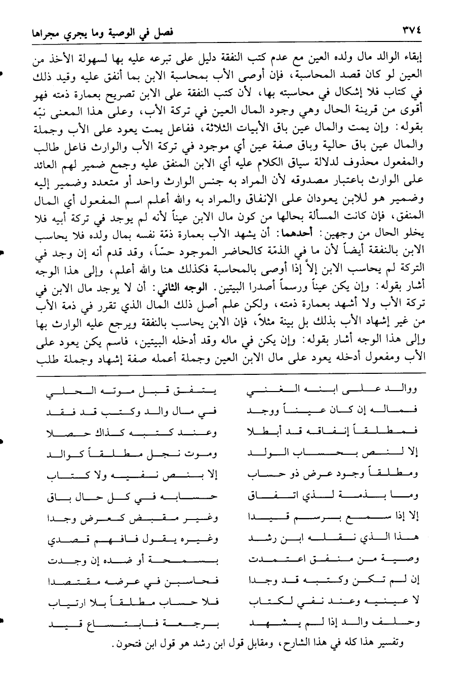 وقيد ذلك في كتاب فلا إشكال في محاسبته بها لأن كتب النفقة على الابن تصريح بعمارة ذمته فهو أقوى من قرينة الحال وهي وجود المال العين في تركة الأب وعلى هذا المعنى نبه بقوله وإن يمت والمال عين باق الأبيات الثلاثة ففاعل يمت يعود على الأب وجملة والمال عين باق حالية وباق صفة عين أي موجود في تركة الأب والوارث فاعل طالب والمفعول محذوف لدلالة سياق الكلام عليه أي الابن المنفق عليه وجمع ضمير لهم العائد على الوارث باعتبار مصدوقه لأن المراد به جنس الوارث واحد أو متعدد وضمير إليه وضمير هو للابن يعودان على الإنفاق والمراد به والله أعلم اسم المفعول أي المال المنفق فإن كانت المسألة بحالها من كون مال الابن عينا لأنه لم يوجد في تركة أبيه فلا يخلو الحال من وجهين أحدهما أن يشهد الأب بعمارة ذمة نفسه بمال ولده فلا يحاسب الابن بالنفقة أيضا لأن ما في الذمة كالحاضر الموجود حسا وقد قدم أنه إن وجد في التركة لم يحاسب الابن إلا إذا أوصى بالمحاسبة فكذلك هنا والله أعلم وإلى هذا الوجه أشار بقوله وإن يكن عينا ورسما أصدرا البيتين الوجه الثاني أن لا يوجد مال الابن في تركة الأب ولا أشهد بعمارة ذمته ولكن علم أصل ذلك المال الذي تقرر في ذمة الأب من غير إشهاد الأب بذلك بل بينة مثلا فإن الابن يحاسب بالنفقة ويرجع عليه الوارث بها وإلى هذا الوجه أشار بقوله وإن يكن في ماله وقد أدخله البيتين فاسم يكن يعود على الأب ومفعول أدخله يعود على مال الابن العين وجملة أعمله صفة إشهاد وجملة طلب
