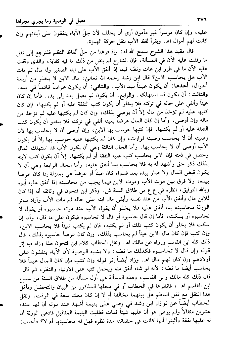 وأما الحال الرابعة وهي أن لا يكون قبض المال ولا صار بيده بعد فسواء كان عينا أو عرضا هي بمنزلة إذا كان عرضا بيده ولا فرق بين موت الأب وموت الابن فيما يجب من محاسبته إذا أنفق عليه أبوه وبالله التوفيق انظره في ع