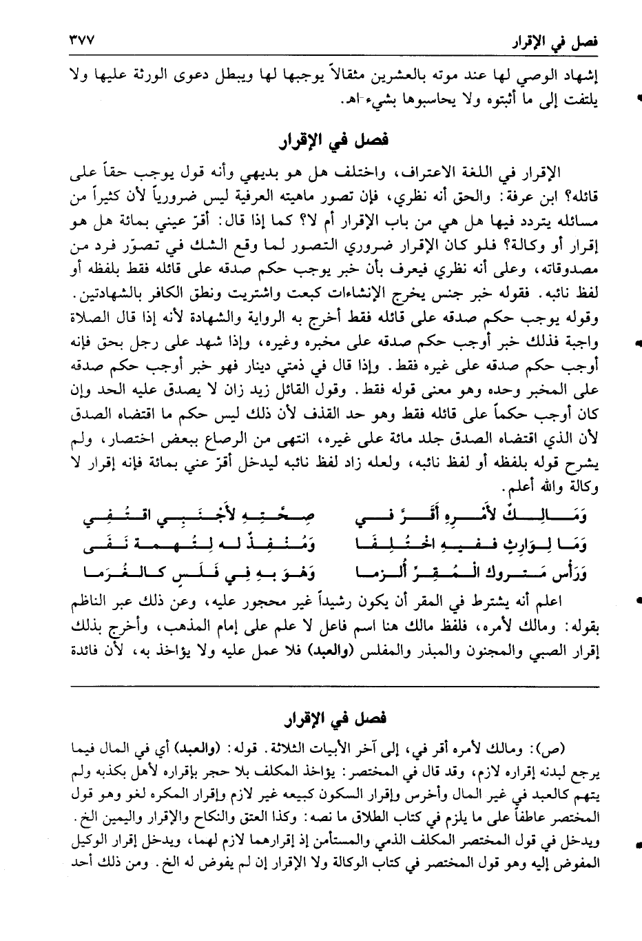 ومالك لأمره أقر في صحته لأجنبي اقتفي وما لوارث ففيه اختلفا ومنفذ له لتهمة نفى ورأس متروك المقر ألزما وهو به في فلس كالغرما اعلم أنه يشترط في المقر أن يكون رشيدا غير محجور عليه وعن ذلك عبر الناظم بقوله ومالك لأمره فلفظ مالك هنا اسم فاعل لا علم على إمام المذهب وأخرج بذلك إقرار الصبي والمجنون والمبذر والمفلس والعبد فلا عمل عليه