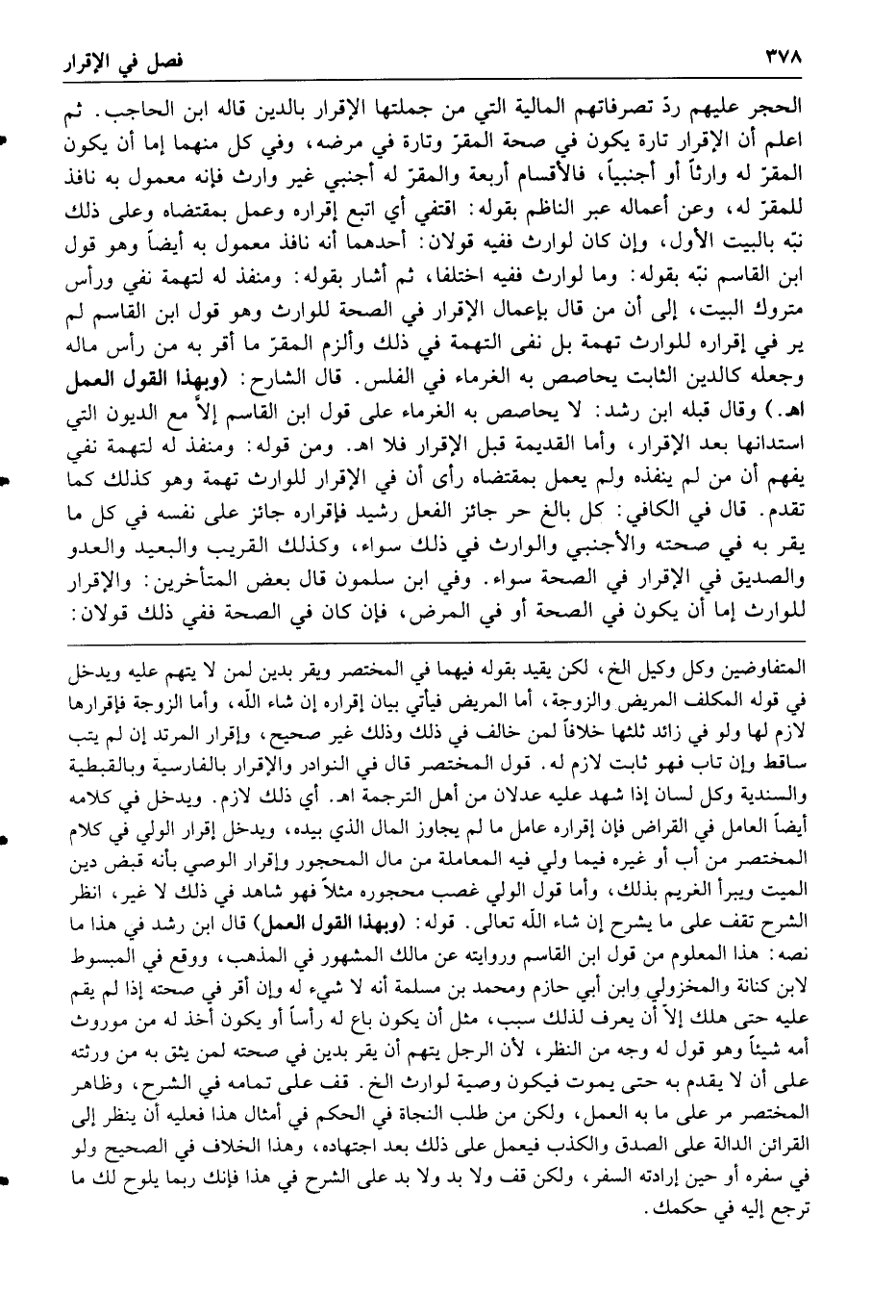 الحجر عليهم رد تصرفاتهم المالية التي من جملتها الإقرار بالدين قاله ابن الحاجب ثم اعلم أن الإقرار تارة يكون في صحة المقر وتارة في مرضه وفي كل منهما إما أن يكون المقر له وارثا أو أجنبيا فالأقسام أربعة والمقر له أجنبي غير وارث فإنه معمول به نافذ للمقر له وعن إعماله عبر الناظم بقوله اقتفي أي اتبع إقراره وعمل بمقتضاه وعلى ذلك نبه بالبيت الأول وإن كان لوارث ففيه قولان