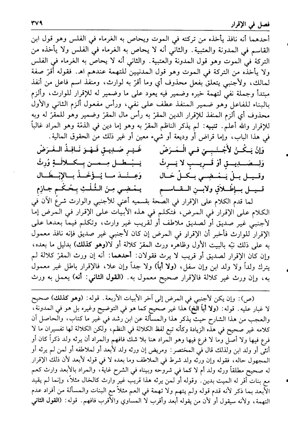 وإن تكن لأجنبي في المرض غير صديق فهو نافذ الغرض ولصديق أو قريب لا يرث يبطل ممن بكلالة ورث وقيل بل يمضي بكل حال وعند ما يؤخذ بالإبطال قيل بإطلاق ولابن القاسم يمضي من الثلث بحكم جازم لما قدم الكلام على الإقرار في الصحة بقسميه أعني للأجنبي والوارث شرع الآن في الكلام على الإقرار في المرض فتكلم في هذه الأبيات على الإقرار في المرض إما لأجنبي غير صديق أو لصديق ملاطف أو لقريب غير وارث وتكلم فيما بعدها على الإقرار للوارث فأخبر أن الإقرار في المرض إن كان لأجنبي غير صديق فإنه نافذ معمول به على ذلك نبه بالبيت الأول وظاهره ورث المقر