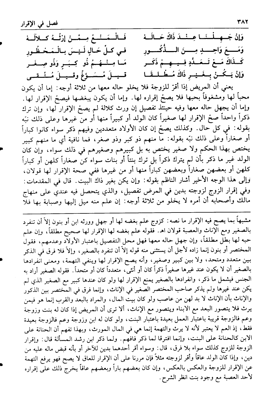 وإن جهلنا عند ذاك حاله فالمنع ممن إرثه كلاله ومع واحد من الذكور في كل حال ليس بالمحظور كذاك مع تعدد فيهم ذكر ما منهم ذو كبر وذو صغر وإن يكن بغير ذاك مطلقا قيل مسوغ وقيل متقى يعني أن المريض إذا أقر للزوجة فلا يخلو حاله معها من ثلاثة أوجه إما أن يكون محبا لها ومشغوفا بحبها فلا يصح إقراره لها وإما أن يكون يبغضها فيصح الإقرار لها وإما أن يجهل حاله معها وفيه حينئذ تفصيل إن ورث كلالة لم يصح الإقرار لها