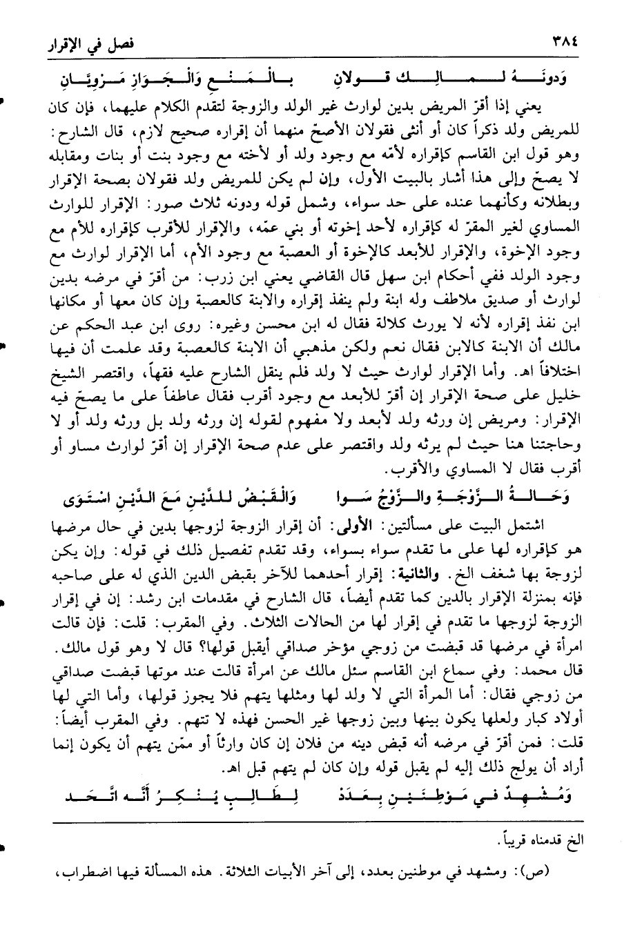 واقتصر الشيخ خليل على صحة الإقرار إن أقر للأبعد مع وجود أقرب فقال عاطفا على ما يصح فيه الإقرار ومريض إن ورثه ولد لأبعد ولا مفهوم لقوله إن ورثه ولد بل ورثه ولد أو لا وحاجتنا هنا حيث لم يرثه ولد واقتصر على عدم صحة الإقرار إن أقر لوارث مساو أو أقرب فقال لا المساوي والأقرب