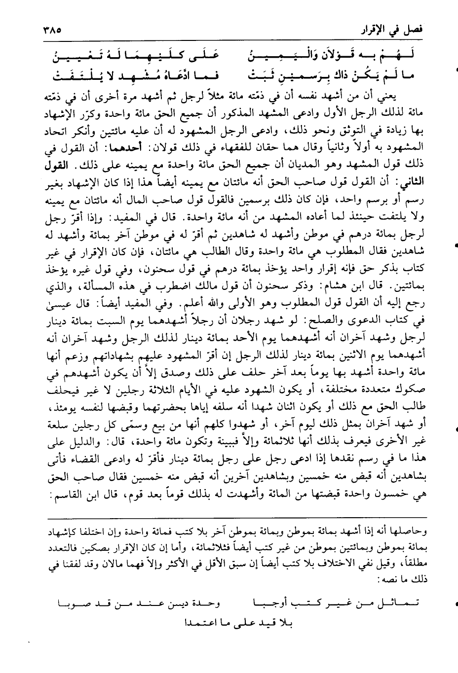 القول الثاني إن القول قول صاحب الحق إنه مائتان مع يمينه أيضا هذا إذا كان الإشهاد بغير رسم أو برسم واحد فإن كان ذلك برسمين فالقول قول صاحب المال إنه مائتان مع يمينه ولا يلتفت حينئذ لما ادعاه المشهد من أنه مائة واحدة قال في المفيد وإذا أقر رجل لرجل بمائة درهم في موطن وأشهد له شاهدين ثم أقر له في موطن آخر بمائة وأشهد له شاهدين فقال المطلوب هي مائة واحدة وقال الطالب هي مائتان فإن كان الإقرار في غير كتاب بذكر حق فإنه إقرار واحد يؤخذ بمائة درهم في قول سحنون وفي قول غيره يؤخذ بمائتين قال ابن هشام وذكر سحنون أن قول مالك اضطرب في هذه المسألة والذي رجع إليه أن القول قول المطلوب وهو الأولى والله أعلم