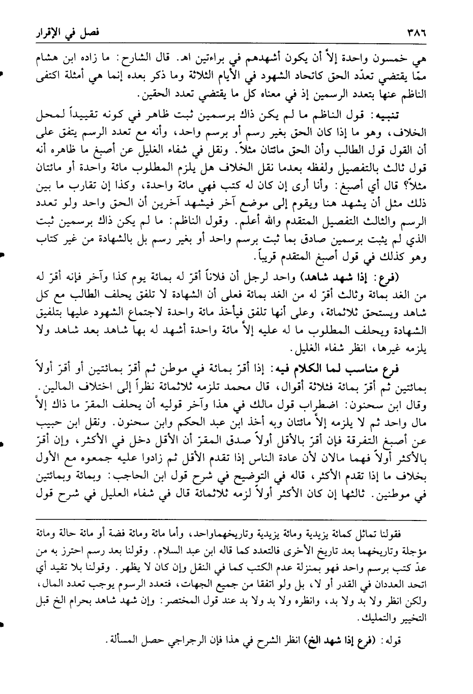 تنبيه قول الناظم ما لم يكن ذاك برسمين ثبت ظاهر في كونه تقييدا لمحل الخلاف وهو ما إذا كان الحق بغير رسم أو برسم واحد وأنه مع تعدد الرسم يتفق على أن القول قول الطالب وأن الحق مائتان مثلا ونقل في شفاء الغليل عن أصبغ ما ظاهره أنه قول ثالث بالتفصيل ولفظه بعد ما نقل الخلاف هل يلزم المطلوب مائة واحدة أو مائتان مثلا قال أي أصبغ وأنا أرى إن كان له كتب فهي مائة واحدة وكذا إن تقارب ما بين ذلك مثل أن يشهد هنا ويقوم إلى موضع آخر فيشهد آخرين أن الحق واحد ولو تعدد الرسم والثالث التفصيل المتقدم والله أعلم