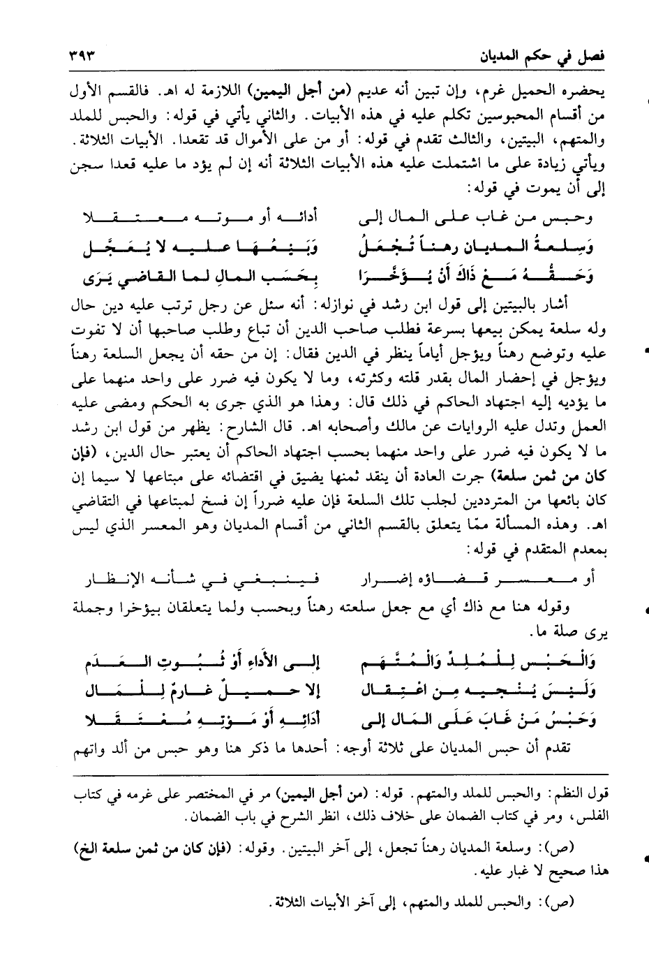 وسلعة المديان رهنا تجعل وبيعها عليه لا يعجل وحقه مع ذاك أن يؤخرا بحسب المال لما القاضي يرى أشار بالبيتين إلى قول ابن رشد في نوازله إنه سئل عن رجل ترتب عليه دين حال وله سلعة يمكن بيعها بسرعة فطلب صاحب الدين أن تباع وطلب صاحبها أن لا تفوت عليه وتوضع رهنا ويؤجل أياما ينظر في الدين فقال إن من حقه أن يجعل السلعة رهنا ويؤجل في إحضار المال بقدر قلته وكثرته وما لا يكون فيه ضرر على واحد منهما على ما يؤديه إليه اجتهاد الحاكم في ذلك