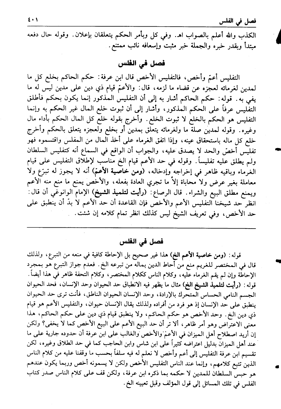 قال الرصاع رأيت لتلميذ الشيخ الإمام الوانوغي أن قال انظر حد شيخنا التفليس الأعم والأخص فإن القاعدة أن حد الأعم لا بد أن ينطبق على حد الأخص وفي تعريف الشيخ ليس كذلك انظر تمام كلامه إن شئت