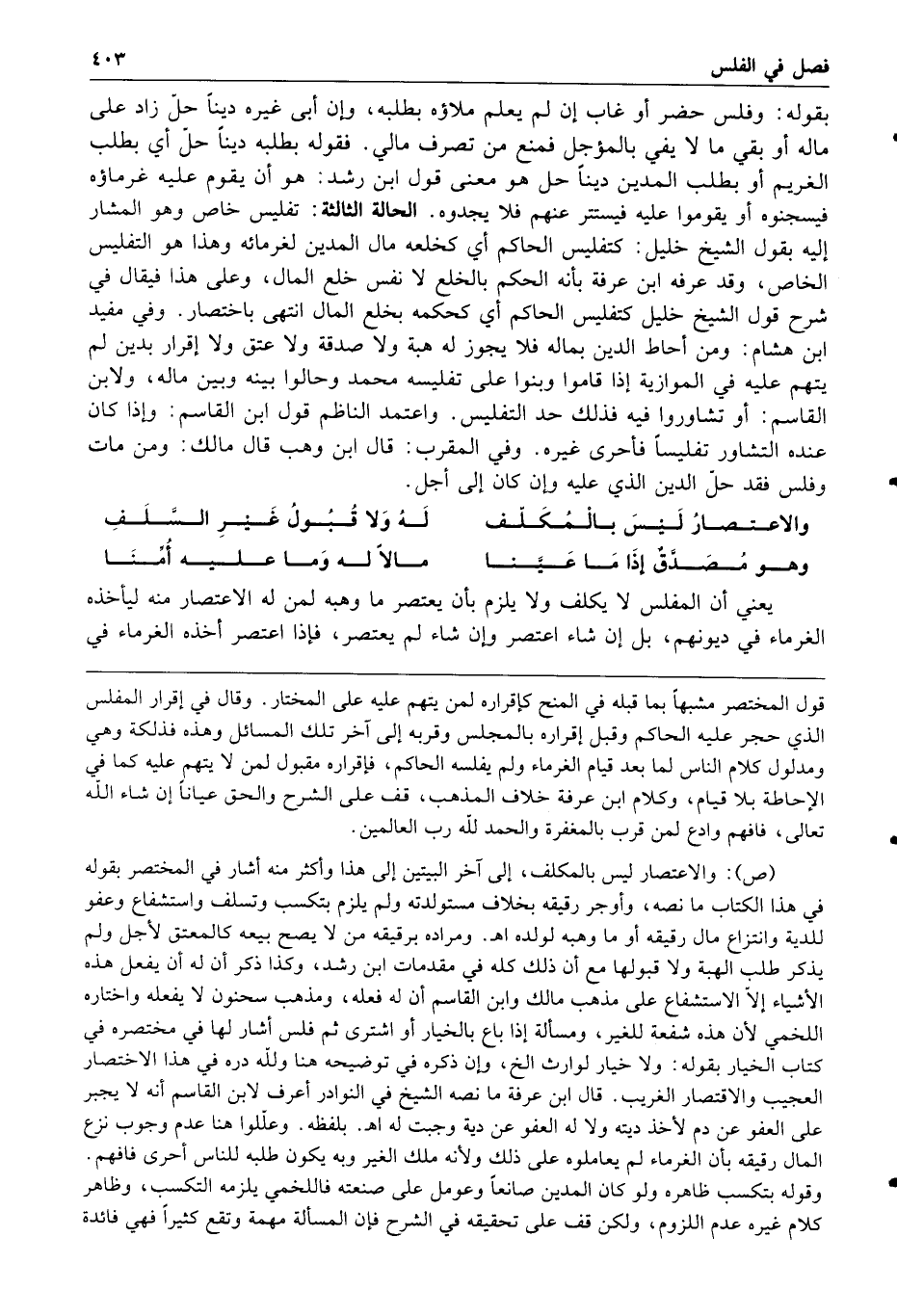 الحالة الثالثة تفليس خاص وهو المشار إليه بقول الشيخ خليل كتفليس الحاكم أي كخلعه مال المدين لغرمائه وهذا هو التفليس الخاص وقد عرفه ابن عرفة بأنه الحكم بالخلع لا نفس خلع المال وعلى هذا فيقال في شرح قول الشيخ خليل كتفليس الحاكم أي كحكمه بخلع المال