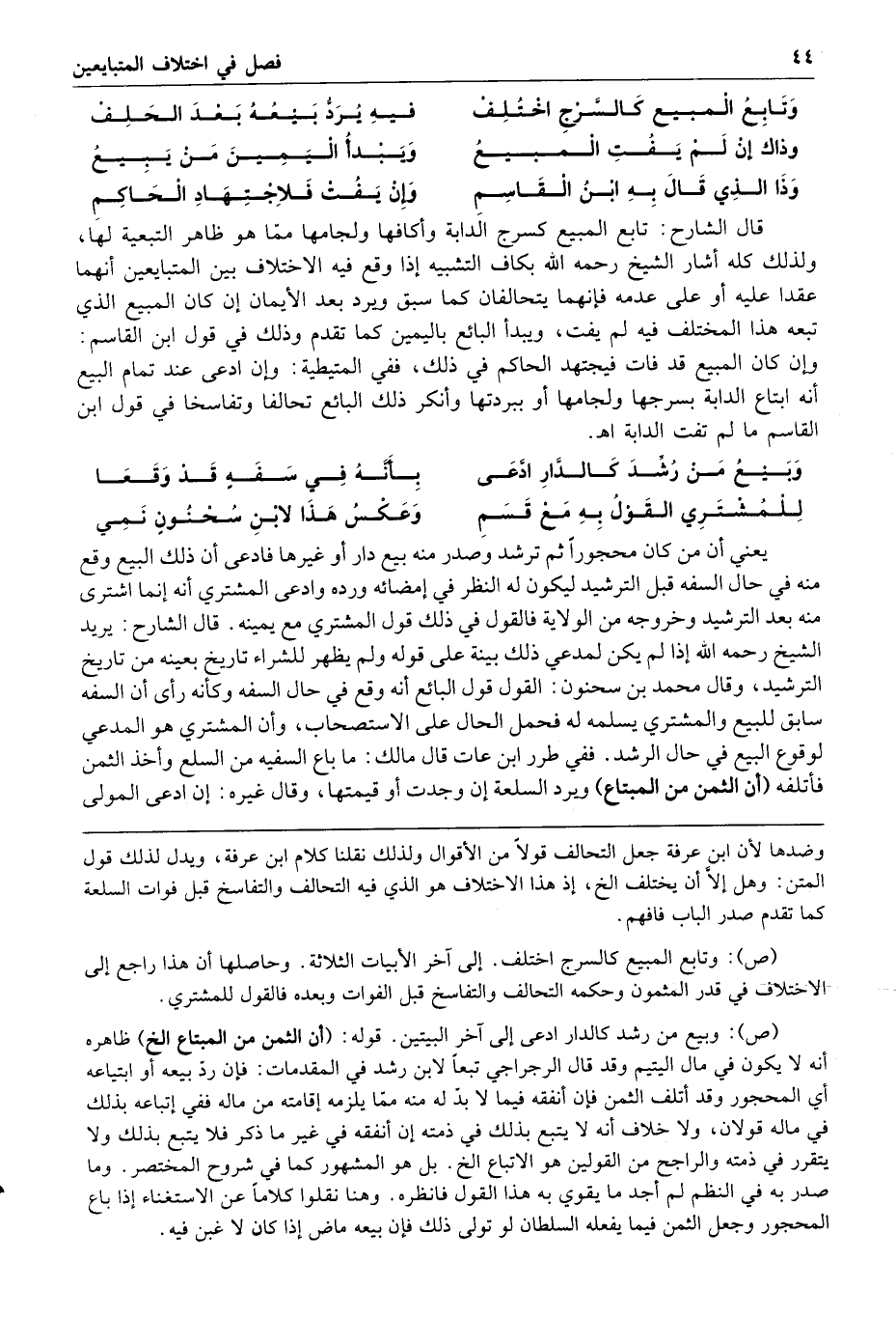 وتابع المبيع كالسرج اختلف فيه يرد بيعه بعد الحلف وذاك إن لم يفت المبيع ويبدأ اليمين من يبيع وذا الذي قال به ابن القاسم وإن يفت فلاجتهاد الحاكم قال الشارح تابع المبيع كسرج الدابة وإكافها ولجامها مما هو ظاهر التبعية لها ولذلك كله أشار الشيخ رحمه الله بكاف التشبيه إذا وقع فيه الاختلاف بين المتبايعين أنهما عقدا عليه أو على عدمه فإنهما يتحالفان كما سبق ويرد بعد الأيمان إن كان المبيع الذي تبعه هذا المختلف فيه لم يفت ويبدأ البائع باليمين كما تقدم وذلك في قول ابن القاسم وإن كان المبيع قد فات فيجتهد الحاكم في ذلك ففي المتيطية وإن ادعى عند تمام البيع أنه ابتاع الدابة بسرجها ولجامها أو ببردتها وأنكر ذلك البائع تحالفا وتفاسخا في قول ابن القاسم ما لم تفت الدابة ا هـ