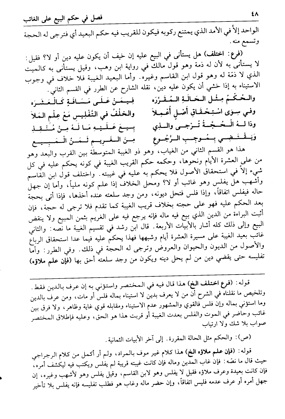 نقله الشارح عن الطرر في القسم الثاني والحكم مثل الحالة المقررة فيمن على مسافة كالعشرة وفي سوى استحقاق أصل أعملا والخلف في التفليس مع علم الملا وذا له الحجة ترجى والذي بيع عليه ماله من منقذ ويقتضي بموجب الرجوع من الغريم ثمن المبيع هذا هو القسم الثاني من الغياب وهو ذو الغيبة المتوسطة بين القرب والبعد وهو من على العشرة الأيام ونحوها وحكمه حكم القريب الغيبة في كونه يحكم عليه في كل شيء إلا في استحقاق الأصول فلا يحكم به عليه في غيبته واختلف قول ابن القاسم وأشهب هل يفلس وهو غائب أو لا ومحل الخلاف إذا علم كونه مليا وأما إن جهل حاله فيفلس اتفاقا وإذا فلس فتحل ديونه ومن وجد سلعته عنده أخذها فإذا أتى بحجة بعد الحكم عليه فهو على حجته بخلاف قريب الغيبة كما تقدم فلا ترجى له حجة فإن أثبت البراءة من الدين الذي بيع فيه ماله فإنه يرجع فيه على الغريم بثمن المبيع ولا ينقض البيع وإلى ذلك كله أشار بالأبيات الأربعة قال ابن رشد في تقسيم الغيبة ما نصه والثاني غائب بعيد الغيبة على مسيرة العشرة أيام وشبهها فهذا يحكم عليه فيما عدا استحقاق الرباع والأصول من الديون والحيوان والعروض وترجى له الحجة في ذلك وفي الطرر وأما تفليسه حتى يقضي دين من لم يحل دينه ويكون من وجد سلعته أحق بها فإن علم ملاؤه
