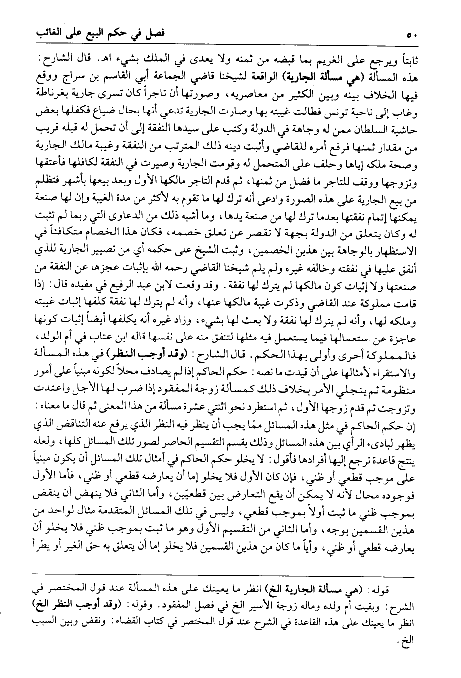 فتظلم من بيع الجارية على هذه الصورة وادعى أنه ترك لها ما تقوم به لأكثر من مدة الغيبة وأن لها صنعة يمكنها إتمام نفقتها بعدما ترك لها من صنعة يدها وما أشبه ذلك من الدعاوى التي ربما لم تثبت له وكان يتعلق من الدولة بجهة لا تقصر عن تعلق خصمه فكان هذا الخصام متكافئا في الاستظهار بالوجاهة بين هذين الخصمين وثبت الشيخ على حكمه أي من تصيير الجارية للذي أنفق عليها في نفقته وخالفه غيره ولم يلم شيخنا القاضي رحمه الله بإثبات عجزها عن النفقة من صنعتها ولا إثبات كون مالكها لم يترك لها نفقة