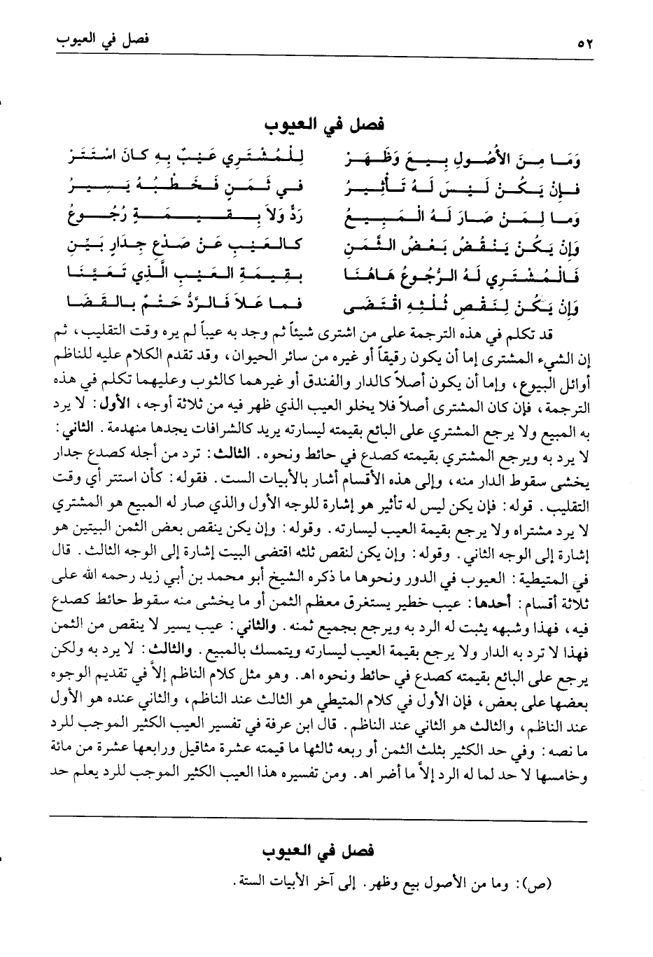 فصل في العيوب وما من الأصول بيع وظهر للمشتري عيب به كان استتر فإن يكن ليس له تأثير في ثمن فخطبه يسير وما لمن صار له المبيع رد ولا بقيمة رجوع وإن يكن ينقص بعض الثمن كالعيب عن صدع جدار بين فالمشتري له الرجوع هاهنا بقيمة العيب إذا تعينا وإن يكن لنقص ثلثه اقتضى فما علا فالرد حتم بالقضا قد تكلم في هذه الترجمة على من اشترى شيئا ثم وجد به عيبا لم يره وقت التقليب ثم إن الشيء المشترى إما أن يكون رقيقا أو غيره من سائر الحيوان وقد تقدم الكلام عليه للناظم أوائل البيوع وإما أن يكون أصلا كالدار والفندق أو غيرهما كالثوب وعليهما تكلم في هذه الترجمة فإن كان المشتري أصلا فلا يخلو العيب الذي ظهر فيه من ثلاثة أوجه