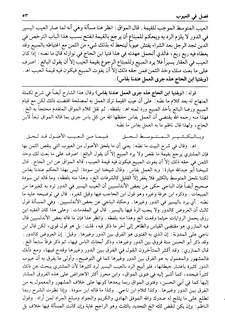 العيب المتوسط الموجب للقيمة قال المواق انظر هنا مسألة وهي أنه لما صار العيب اليسير في الدور لا يلزم الرد به ويحكم للمبتاع إن يرجع بالقيمة انفتح بسبب هذا الباب الترخص في الدين تجد الرجل بعد الشراء يفتش عيوبا لينحط له بذلك شيء من الثمن مع اغتباطه بالمبيع وقد يعطاه فيه ربع ربع فالذي أتحمل عهدته في هذا فتيا ابن الحاج في نوازله قال ما نصه إذا كان العيب في العقار يسيرا فلا يرد المبيع وللمبتاع الرجوع بقيمة العيب إلا أن يقول البائع اصرف على ما بعت منك وخذ الثمن فمن حقه ذلك إلا أن يفوت المبيع فيكون فيه قيمة العيب ا هـ وبفتيا ابن الحاج هذه جرى العمل عندنا بفاس