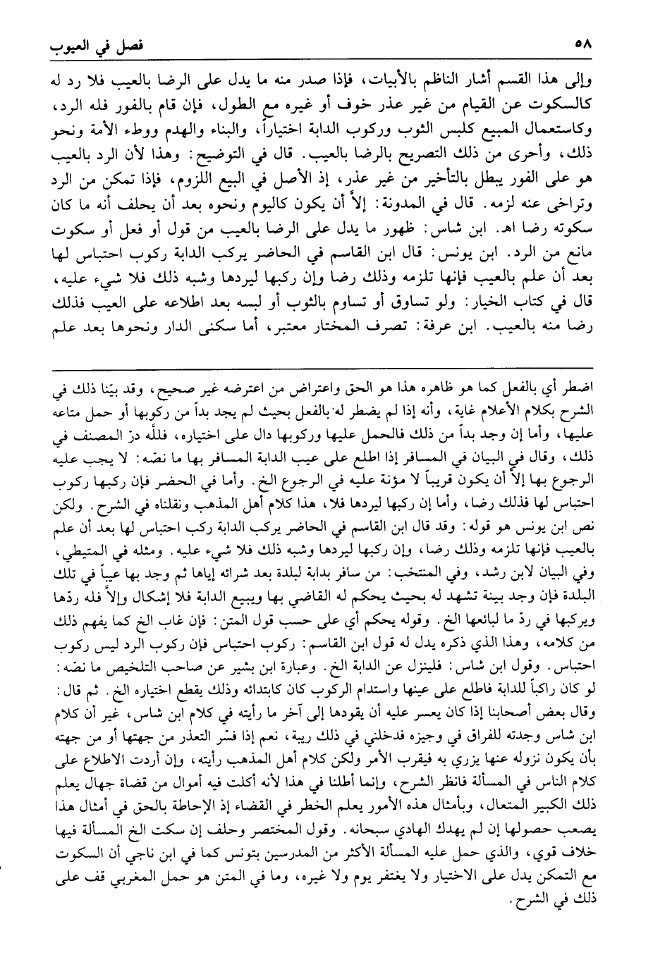 ا هـ ابن شاس ظهور ما يدل على الرضا بالعيب من قول أو فعل أو سكوت مانع من الرد ابن يونس قال ابن القاسم في الحاضر يركب الدابة ركوب احتباس لها بعد أن علم بالعيب فإنها تلزمه وذلك رضا وإن ركبها ليردها وشبه ذلك فلا شيء عليه قال في كتاب الخيار ولو تساوق أو تساوم بالثوب أو لبسه بعد اطلاعه على العيب فذلك رضا منه بالعيب
