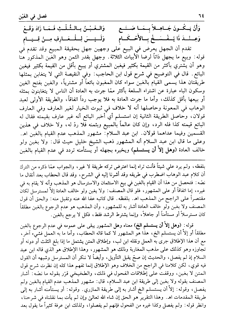 وأن يكون جاهلا بما صنع والغبن بالثلث فما زاد وقع وعند ذا يفسخ بالأحكام وليس للعارف من قيام تقدم أن الجهل يعرض في البيع على وجهين جهل بحقيقة المبيع وقد تقدم في قوله وبيع ما يجهل ذاتا لرضا الأبيات الثلاثة