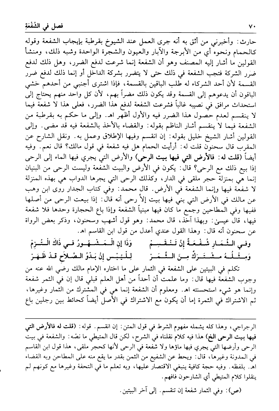 وفي الثمار شفعة إن تنقسم وذا أن المشهور في ذاك التزم ومثله مشترك من الثمر لليبس إن بدو الصلاح قد ظهر تكلم في البيتين على الشفعة في الثمار على ما اختاره الإمام مالك رضي الله عنه من وجوب الشفعة فيها قال وما علمت أن أحدا من أهل العلم قبلي قال إن في الثمر شفعة وإنما هو شيء استحسنته ا هـ ومعلوم أن الشفعة إنما هي في المشترك من الثمار وغيرها ثم الاشتراك في الثمرة إما أن يكون مع الاشتراك في الأصل أيضا كحائط بين رجلين باع