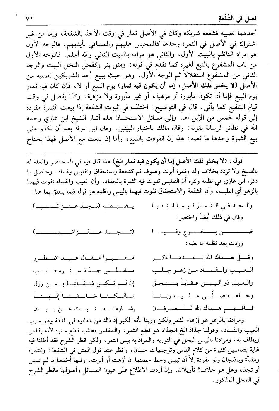 أحدهما نصيبه فشفعه شريكه وكان في الأصل ثمار في وقت الأخذ بالشفعة وإما من غير اشتراك في الأصل في الثمرة وحدها كالمحبس عليهم والمساقى بأيديهم فالوجه الأول هو مراد الناظم بالبيت الأول والثاني هو مراده بالبيت الثاني والله أعلم فالوجه الأول من باب المشفوع بالتبع لغيره كما تقدم في قوله ومثل بئر وكفحل النخل البيت والوجه الثاني من المشفوع استقلالا ثم الوجه الأول وهو حيث يبيع أحد الشريكين نصيبه من الأصل لا يخلو ذلك الأصل إما أن يكون فيه ثمار يوم البيع أو لا فإن كان فيه ثمار يوم البيع فإما أن تكون مأبورة أو مزهية أو غير مأبورة ولا مزهية وكذا يفصل في وقت قيام الشفيع كما يأتي