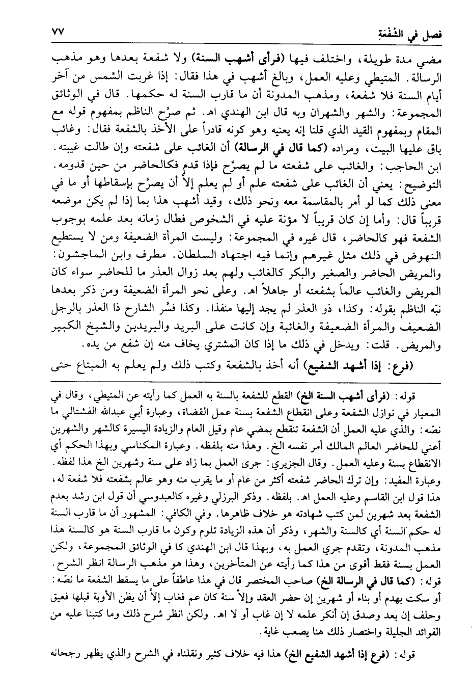 مضي مدة طويلة واختلف فيها فرأى أشهب السنة ولا شفعة بعدها وهو مذهب الرسالة المتيطي وعليه العمل وبالغ أشهب في هذا فقال إذا غربت الشمس من آخر أيام السنة فلا شفعة ومذهب المدونة أن ما قارب السنة له حكمها