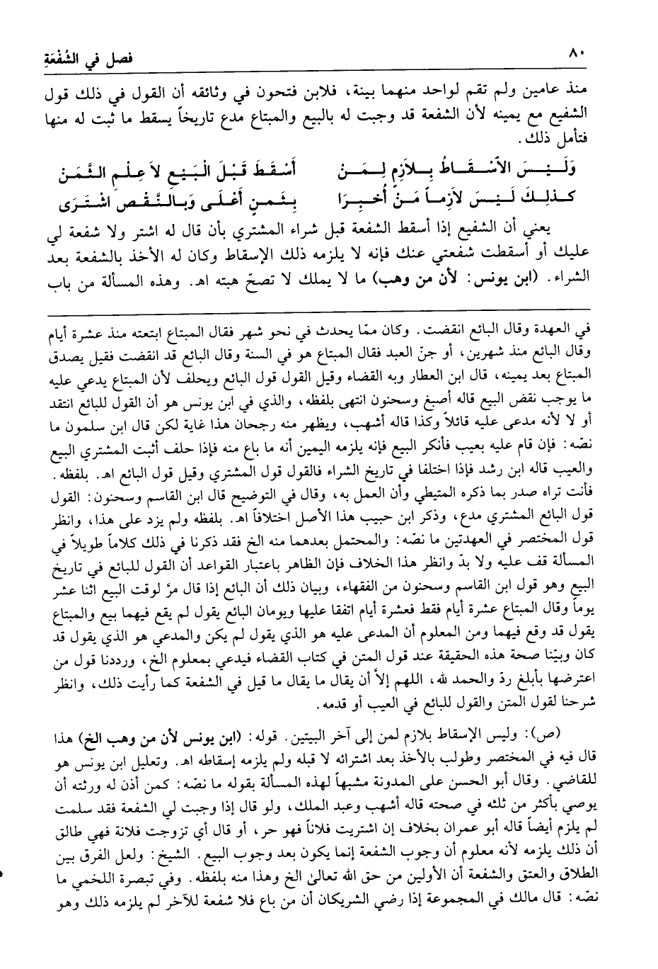 منذ عامين ولم تقم لواحد منهما بينة فلابن فتحون في وثائقه أن القول في ذلك قول الشفيع مع يمينه لأن الشفعة قد وجبت له بالبيع والمبتاع مدع تاريخا يسقط ما ثبت له منها فتأمل ذلك