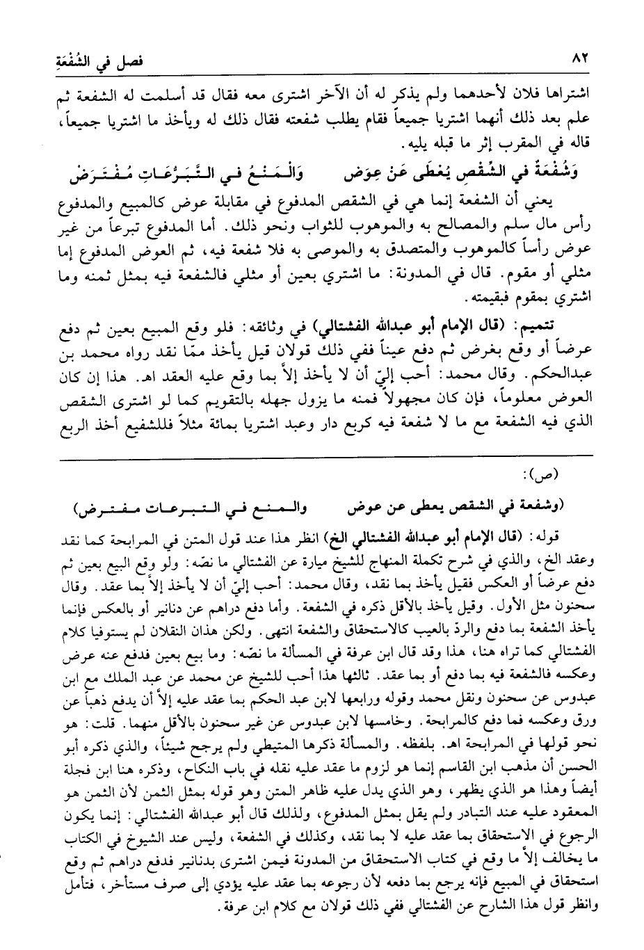 وشفعة في الشقص يعطي عن عوض والمنع في التبرعات مفترض يعني أن الشفعة إنما هي في الشقص المدفوع في مقابلة عوض كالمبيع والمدفوع رأس مال سلم والمصالح به والموهوب للثواب ونحو ذلك أما المدفوع تبرعا من غير عوض رأسا كالموهوب والمتصدق به والموصى به فلا شفعة فيه ثم العوض المدفوع إما مثلي أو مقوم قال في المدونة ما اشتري بعين أو مثلي فالشفعة فيه بمثل ثمنه وما اشتري بمقوم فبقيمته